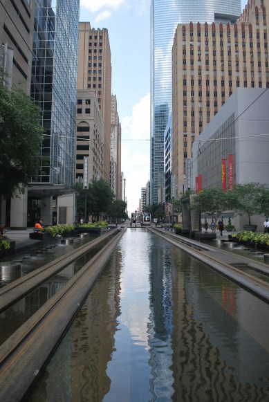 After I was done at Discovery Green, I walked downtown and got a sub at Jimmy John’s for lunch. I don’t know what it was, but it just didn’t taste right. They may have not been using the freshest ingredients, but the sub left something to be desired. Jimmy John’s is on main street, and the metro rial system runs right down the middle of said street. There’s even a part where the track runs over some water, as seen below. It seems like a very quiet and comfortable ride. You can see one of the trains in the distance on the track on the right.