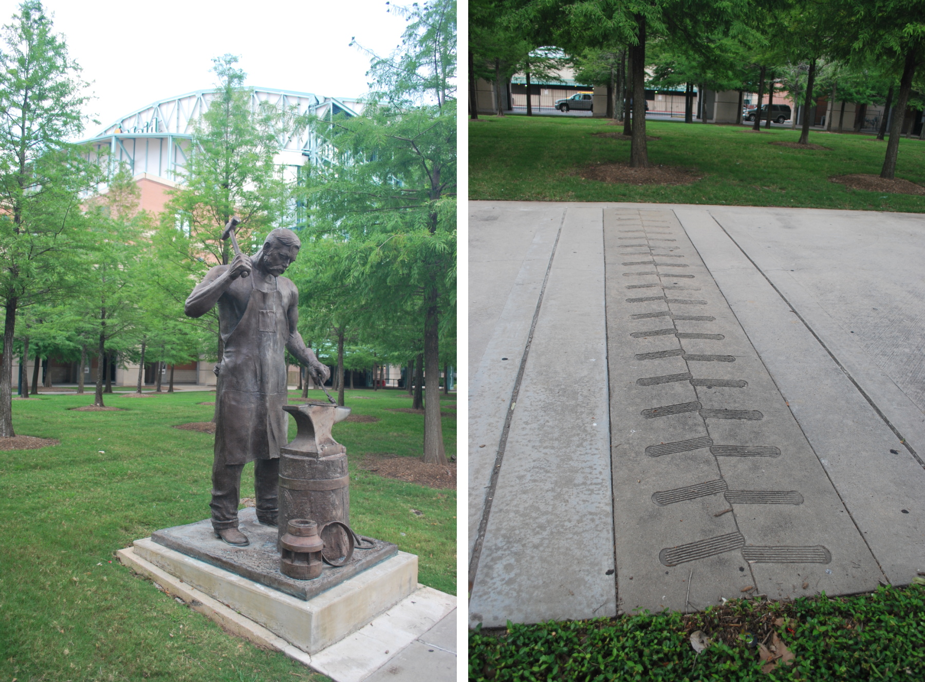 There were two last things that I thought were interesting. On the left you have a statue of somebody, but I’m not sure who. There’s no plaque, and the only visible text is “Stewart E. Stevenson” on the anvil. A google search with that name and “Astros” doesn’t bring up anything that connects the two, so it’s a mystery right now (for me anyways). On the right is baseball stitching that separates segments of sidewalk. They have this going all around the exterior of the ballpark, and I didn’t make the observation until my second day at the stadium. The ones that I had seen up to this point weren’t as obvious as the one below, so I’ll cut myself a little bit of slack, but not much.