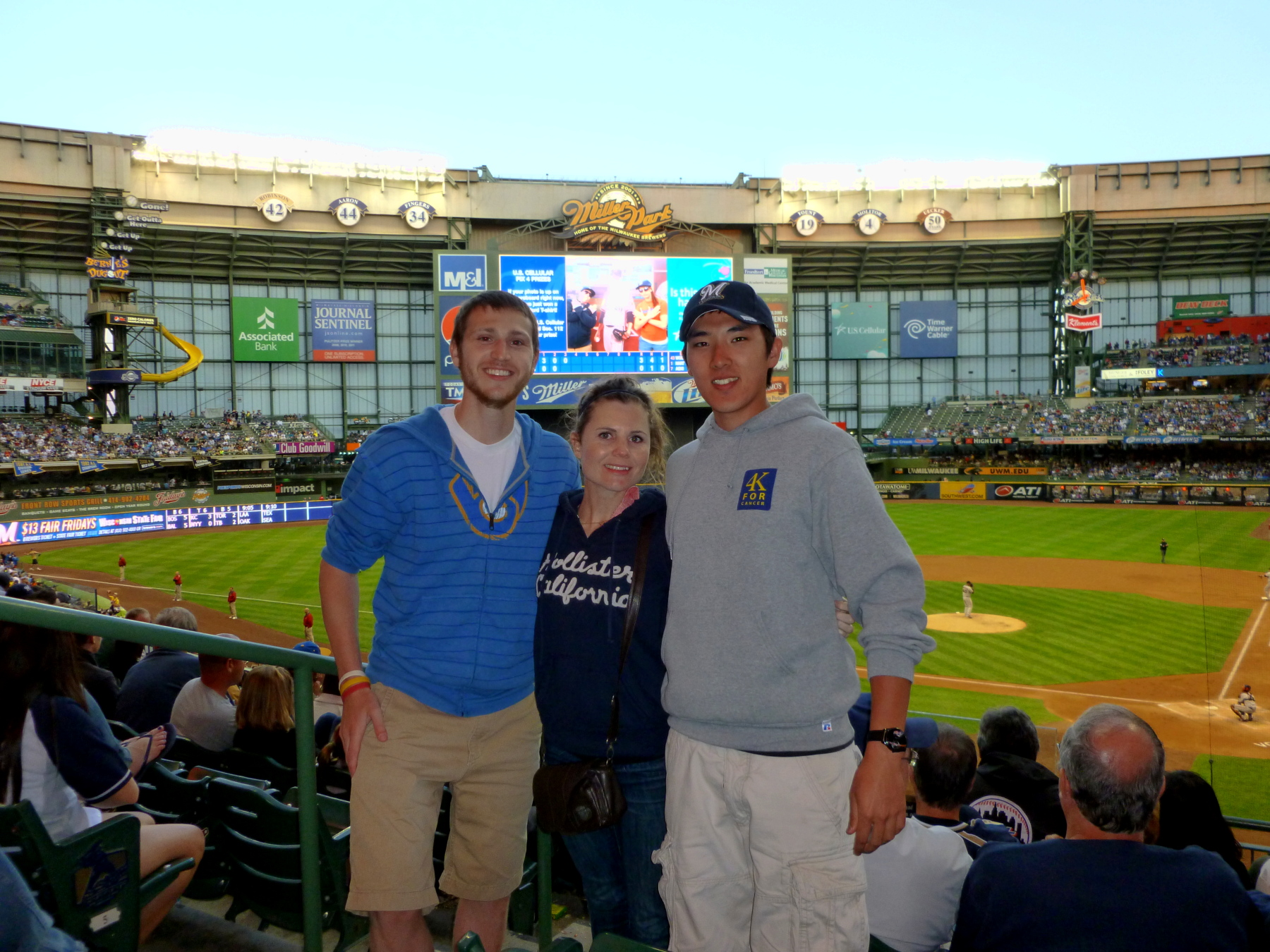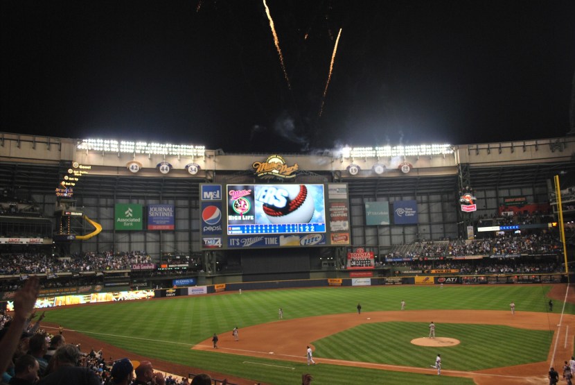 The three of us made it to our seats and relaxed as we waited for the game to start. Chrismare had only been to baseball games in South Korea while visiting Dong, so this was her first MLB experience. She said she enjoyed herself, despite it being a somewhat boring game (on some people’s scorecards). As great as Sunday’s game had started for the Brewers, it was equally as bad on Tuesday. Randy Wolf walked two batters in the first inning, then gave up a 3-run home run to the Giant’s Buster Posey. The game remained 3-0 until the bottom of the sixth, when an RBI double by Aramaris Ramirez cut the lead to two runs. It was still 3-1 going into the bottom of the eighth, and Maysonet and Hart were out on strikes with a total of seven pitches between them. That’s when Norichika Aoki reached first on a fielding error by the Giant’s shortstop. The Giants manager left the starter (a lefty) in to face Braun, and Ryan made him pay. On a 1-2 pitch Braun cranked a massive game tying two run home run to left center, and it was a game again. The Brewers reported on the jumbotron that the ball traveled 459 feet, but I go to Hit Tracker Online for what I believe to be more accurate estimates (they claimed 437 feet for the home run). As Braun was halfway between third and home on his trot I pulled out my camera and got a picture, as the fireworks were still being fired, good stuff.