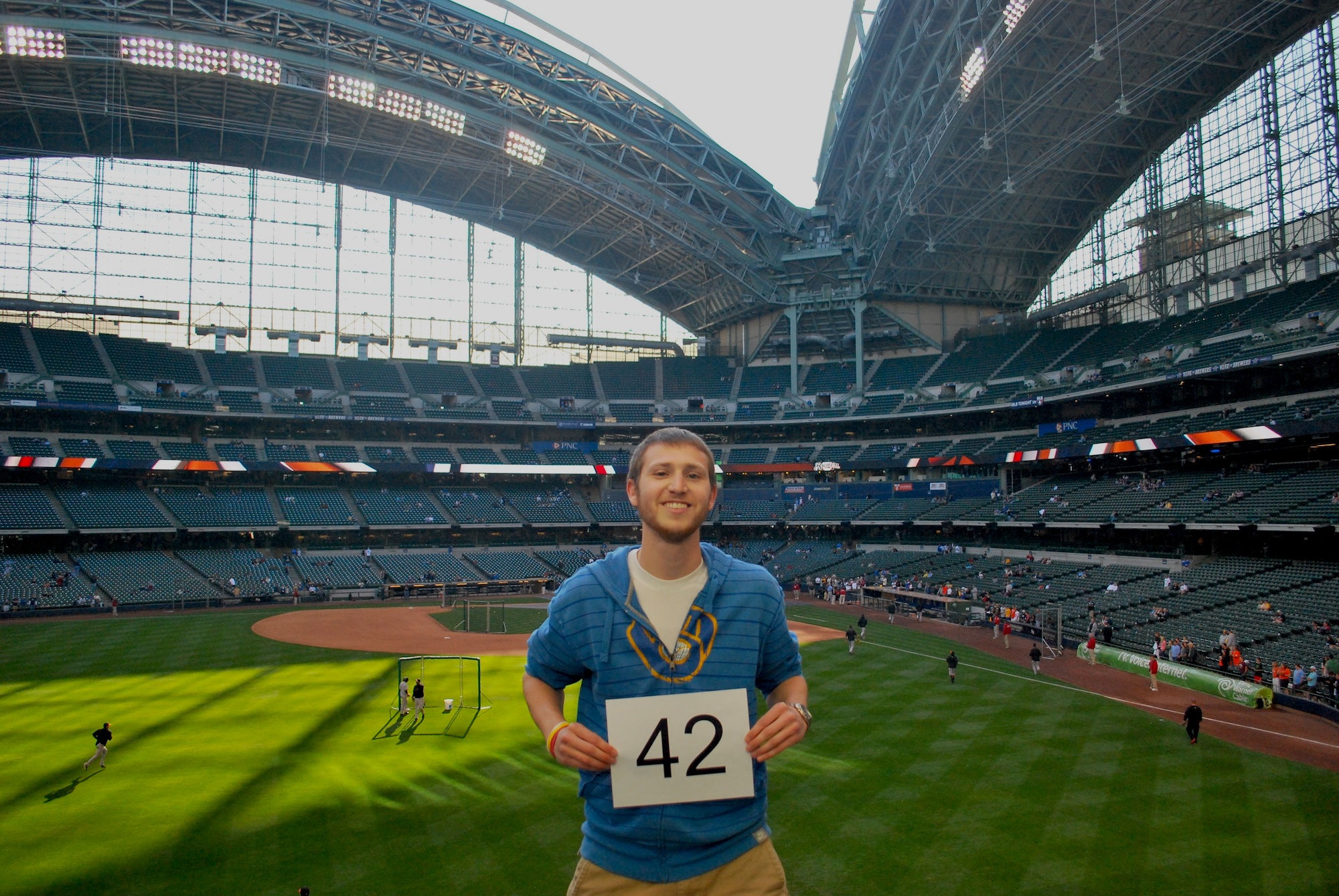 We pulled into the Brewers 1 lot at 5:22, and I spent some time handing out business cards and trying to get people involved. I also did a live on-air interview with The Big 1070, which is one of Madison’s Sports Radio stations. I talked about what I’m doing and why, how it’s going so far, and that I was trying to auction off a great seat to Tuesday’s game. They repeated my twitter handle twice on air, but I’m guessing their audience is either not on twitter, or they just didn’t care about it, because I gained one follower after I was on the air (and zero bids). I was hoping to get more for the ticket than the $82.11 that I got, but anything is better than nothing. I’m grateful for Mark The Doorman who donated the tickets, and for Jeff, who had the winning bid.