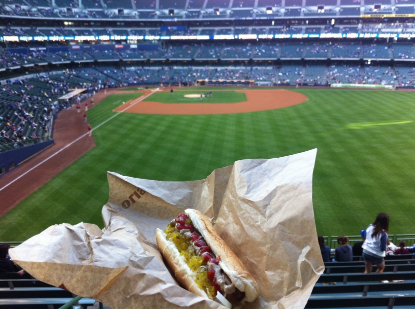 Now some unfortunate news; I’m almost positive my knee pain has been stemming from an MCL tear. At some point in the game, probably extras, I quickly got up to chase what I thought would be a nearby foul ball. An immediate sharp pain on the medial side of my left knew stopped me in my tracks. It was painful, but didn’t realize how painful until I tried to race up the steps to get another hot dog later in the game. I got about two steps before I realized I wasn’t going anywhere, and had to rely heavily on the railing to get bak to my seat. I read up on MCL injuries when I got home and they usually start with a small bruise on the medial part of the knee (what I had when it first started hurting). I’m thinking it was a grade one injury, but then all the miles that I’ve put on it and the quick movement yesterday made it more severe. Rest is the only real solution, so I’m not sure what’s going to happen. If you see me gimping around Miller Park trying to not bend my knee, you’ll know why. Don’t worry though, Dong went up and got us each another hot dog, making it four for each of us, and two for Chrismare.