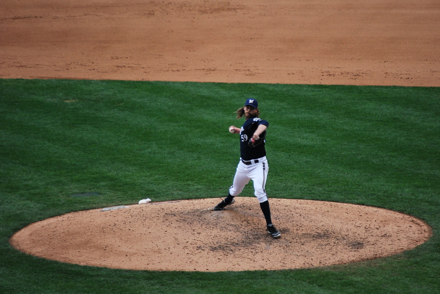 With the injury to Estrada and all the runs that were scored in the first two innings, the game was dragging along, which made me nervous. It was a 12:10 start time, and my flight to Denver was scheduled to depart at 6:20. It doesn’t sound like a problem but if the game went to extras or if it just took forever I could have been cutting it close. The Giants made it interesting after scoring three in the third and two in the fourth, and the lead was just three. The game quickened as it got later (which is usually the opposite of how it goes). Jose Veras retired all six batters he faced, and only needed 22 pitches to get through the sixth and seventh. When a starter doesn’t qualify for a win (by not pitching at least five innings) the official scorekeeper can basically decide who deserved the win, and he awarded it to Veras. Axford came on in the ninth, and retired the side with just 11 pitches, including two via the strikeout. My last picture of the day is of Axford delivering a pitch in the ninth with his hair flailing behind him.