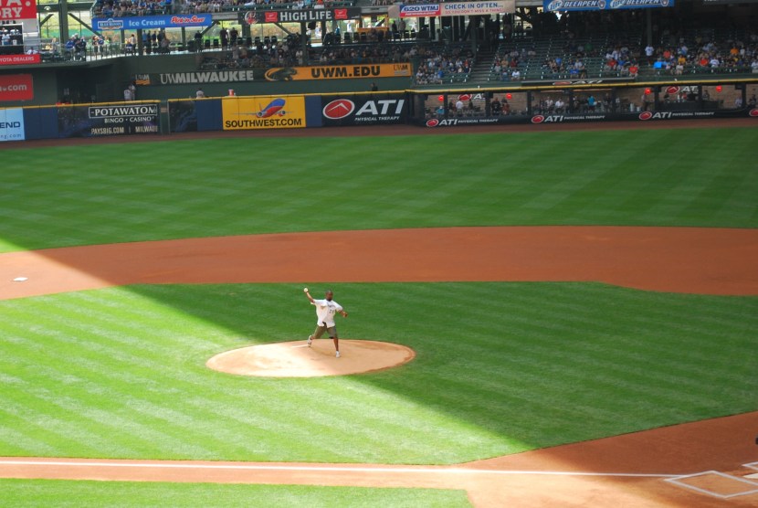 I spent the last few minutes before the game standing (just in the shade), in front of the press box. I knew that I would be in the sun for at least on hour and a half, so I wanted at least a little bit of time in the shade. As I was getting to my seat Charles Woodson was being introduced to throw out a first pitch. I didn’t have my zoom lens on my camera yet, so this will have to do.