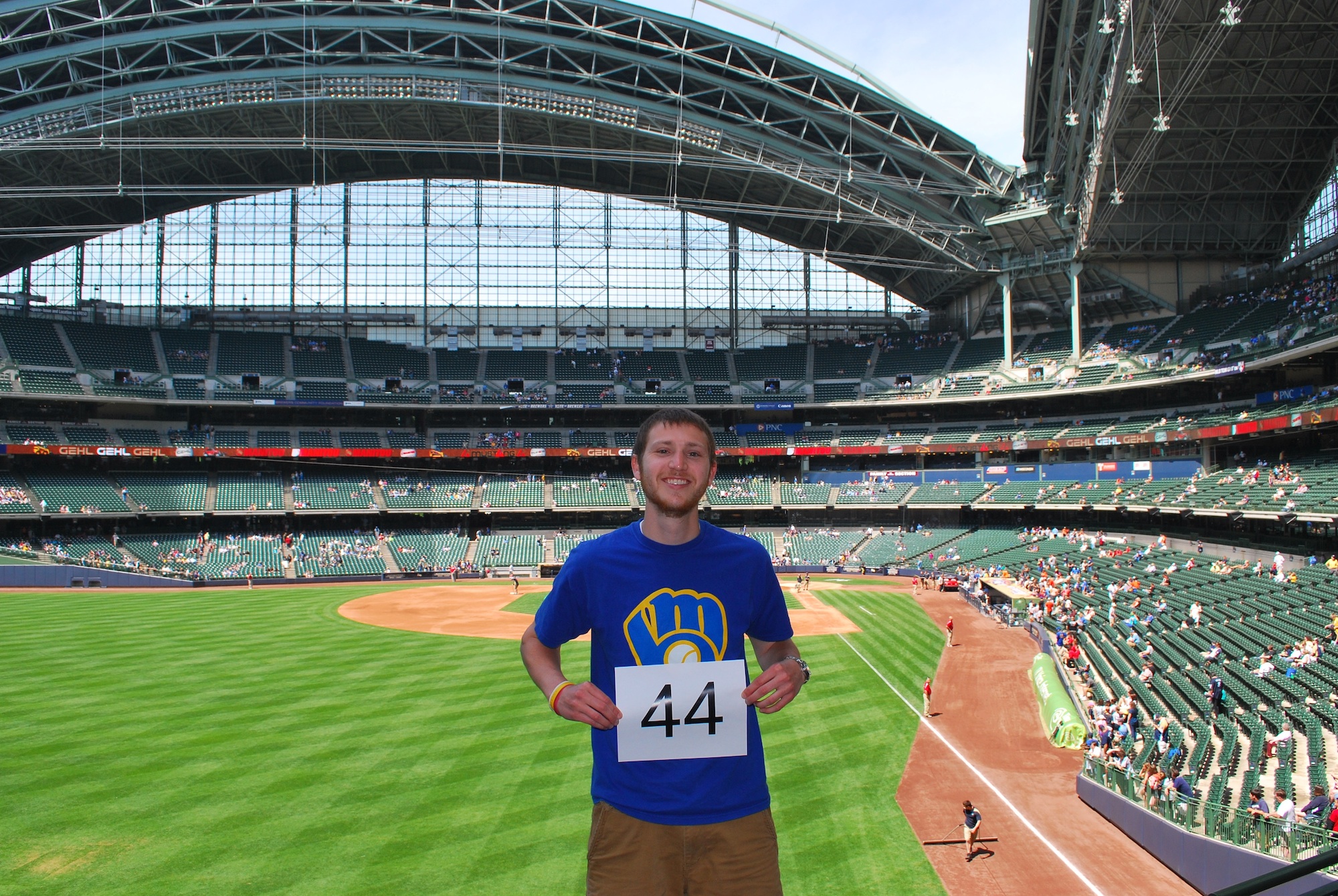 I was inside Miller Park by 11:05, and I headed straight for section 234, where I got my game number photo taken. It took a little bit to find a setting where we could override the automatic flash. The field was bright but I wasn’t in the sun, so for the first few pictures I was basically just a shadow.