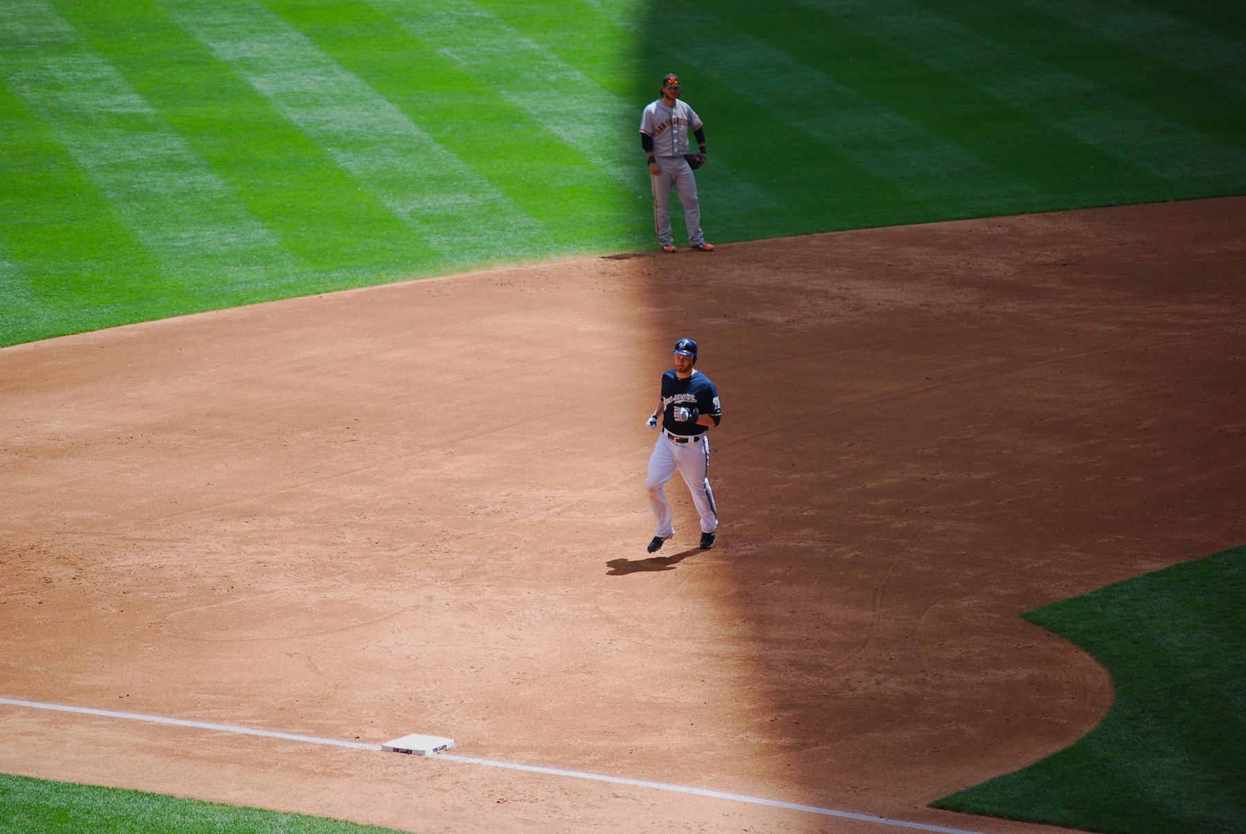 The game got underway and the Brewers had a great first inning. Marco Estrada retired the first three Giants in order, and only needed 10 pitches to do so. The Brewers then got on the board quickly with six runs in the bottom of the inning. Two Giants errors helped the Crew out, and only two of the runs in the first were earned. Estrada hit a double to plate the final two runs of the inning but pulled up with a hip flexor strain. He actually injured himself as he was getting to first, but still made his way to second base. The Brewers were forced to go to the bullpen for eight innings, and luckily the off day on Thursday will give the pen some rest. In the second inning the Brewers added two runs on a Jonathan Lucroy home run to left. Here’s Lucroy coming out of the roof’s shadow and into the light. He is raking right now and I hope it continues. I recommend voting for him for the All-Star Game, he is very deserving (as is Braun).