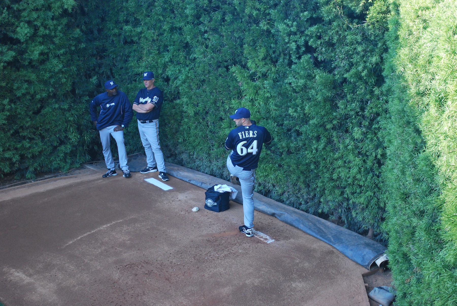 After getting the game number picture taken we went to our seats, which were located right next to the Brewers bullpen in right field. We got to see Mike Fiers warming up for his first major league start. He pitched in two games last September, but those were out of the bullpen, in mop up duty. As Fiers was warming up I really didn’t know what to expect for the game. To be completely honest, I expected the Dodgers to win 10-2, or something along those lines. It seemed like a perfect storm; Lucroy going to the DL, a rookie catcher making his first start, catching a rookie pitcher making HIS first start, and the Dodgers getting Matt Kemp (their MVP) back from the DL. Here’s Fiers warming up: