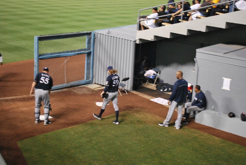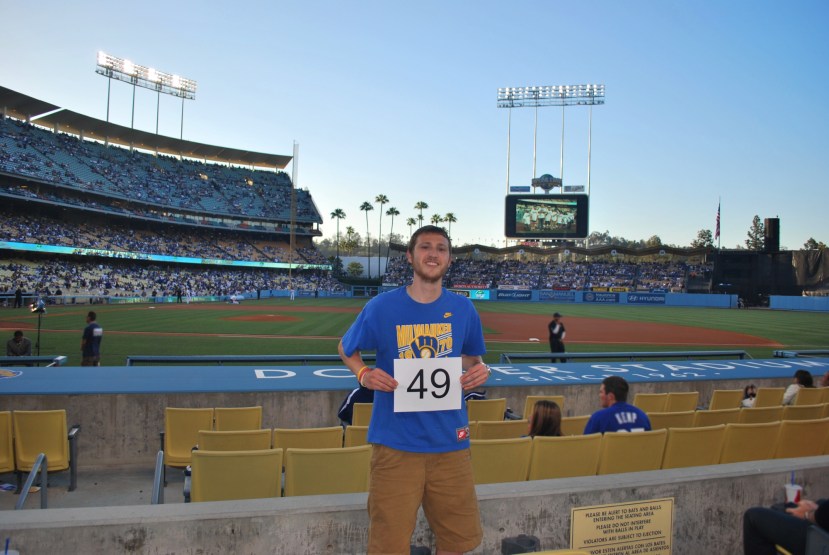 I was planning on meeting Adam McCalvy, the Brewers beat writer, before the game on Tuesday. Due to LA rush hour traffic Dustin and I weren’t parked until 6:13, and didn’t get inside Dodger Stadium until 6:30. I texted Adam and he said not to worry, and that he got us batting practice field passes for Wednesday’s game. Sweet!