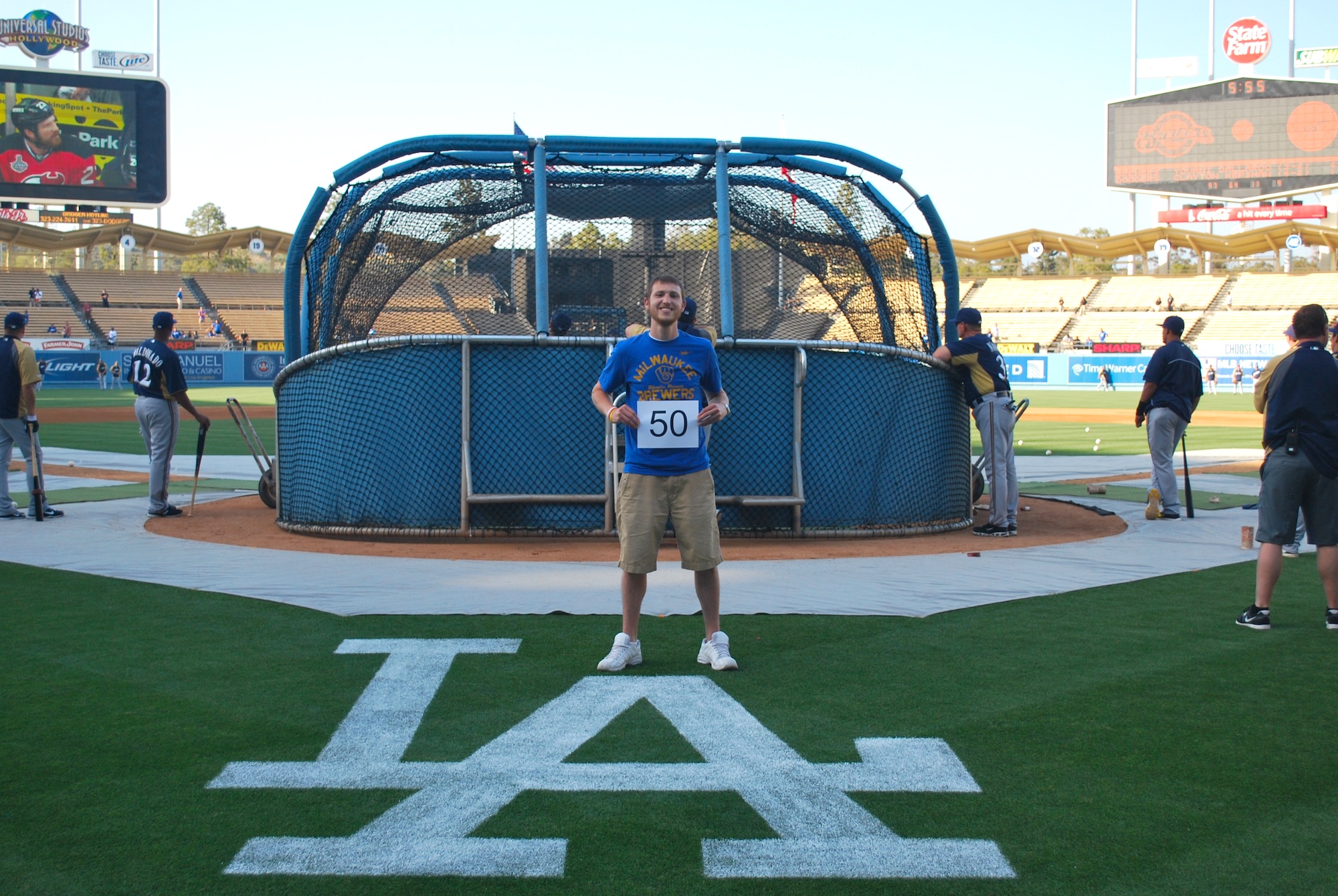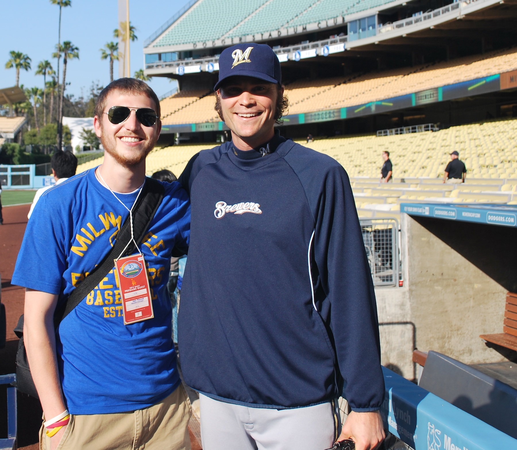 We went on the field, and it was awesome just being out there during batting practice. The Dodgers were just finishing up their BP session, so I was able to chat for a bit with Tim Dillard. He’s a reliever for the Brewers, and I mentioned him in the first post in Phoenix when I shouted a Harry Caray impersonation his way. Adam reads the blog and had told Dillard about the guy who yelled that at him, so he was already familiar with what I was doing. He told me that people (obviously) yell stuff at him all the time, so in Phoenix when when I yelled he was a little reluctant to look up. Once he saw it was a Brewers fan, though, he was cool with it. He’s a really nice guy, and we talked for five minutes or so before he had to take off and shag fly balls during the Brewers portion of BP. I couldn’t pass up the opportunity to get a picture taken with him, and he graciously agreed.