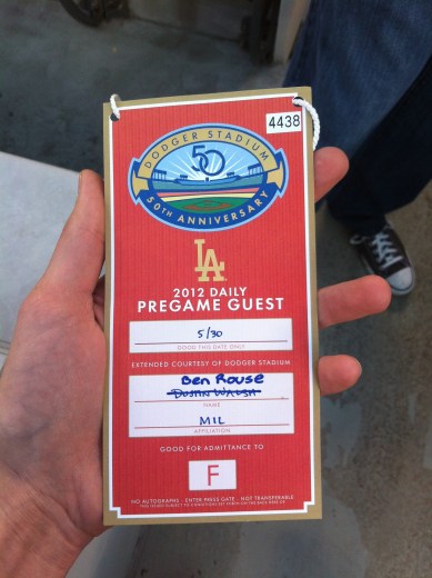 A Dodger Stadium employee was talking with the group as he led them (us) down to the field level, and he asked Joe if he needed an extra four tickets. Joe didn’t but he asked me if I did. I said that I was planning on using the Brewers provided ticket but then would have to sit apart from Dustin, and said I’d take them if no one needed them. We used those tickets and they were great seats. I thanked him and Joe, and we parted ways as we entered the seating bowl on the field level. I texted Adam and told him we were already inside, he was by the Brewers dugout and had us come down onto the field. We got field level passes, and apparently Dustin must be a big deal, because both of the passes had his name on them at one point: