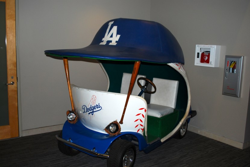 After leaving Warner Bros. we went back to Simon’s place and got ready for the game. Adam McCalvy had told us to meet him at Dodger Stadium at around 5:30, and that was our original plan. Dustin and I got to the Dodger Stadium parking lot entrance around 4:55, but they don’t open the parking lots until 5:10 for 7:10 games. We were one of the first cars parked, and while doing so we saw some people in Braun shirts/jerseys. I swore one of them was Joe Braun, who I met on April 30th in San Diego. Dustin and I hustled and got our stuff and caught up with them as they went up the staircase outside of the left field corner. I said Joe’s name and he turned around (and luckily) remembered me and introduced me to who he was with. He had told them about me prior to Wednesday, and said that he still had my phone number, so that was cool. Braun’s mom Diane was there as well, and I think she was more excited to meet me than I, her. She got a picture taken with me and sent it to a friend with “I MET THE BLOGGER” as the text. I told Joe that we were going to meet up with Adam McCalvy, and Joe asked if we wanted to just go in with them. Dustin and I couldn’t turn that down, and we went in on the Club Level, and proceeded around towards home plate. They have some old memorabilia in the club level, but we were trying to keep up with everyone so I just got a few pictures. This was the former bullpen car, which the Dodgers would use to bring in a reliever (they had it so easy back then…).