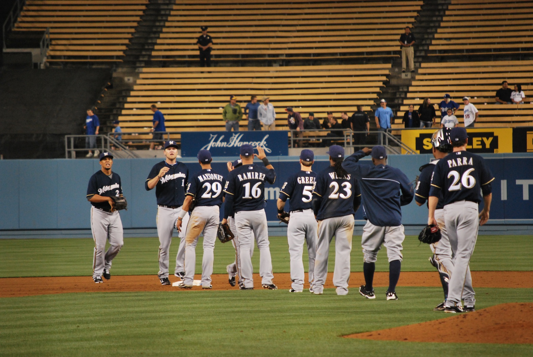 Dillard recorded two outs in the ninth thanks to a double play ball. The Brewers turned three in the game, and eight in the series. When you get outhit in every game but one, and still complete a four game sweep, something had to be going right. Before saying goodbye to Diane and Joe, I captured the Brewers as they gave each other the traditional post-win high fives. It’s the first time the Brewers have EVER swept the Dodgers, home or away, in a two, three, or four game series. Good stuff all around.