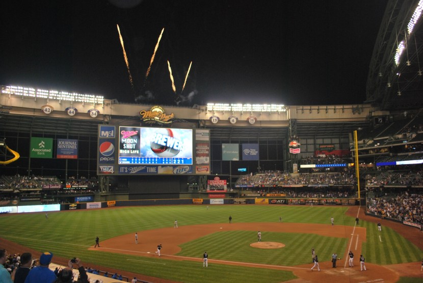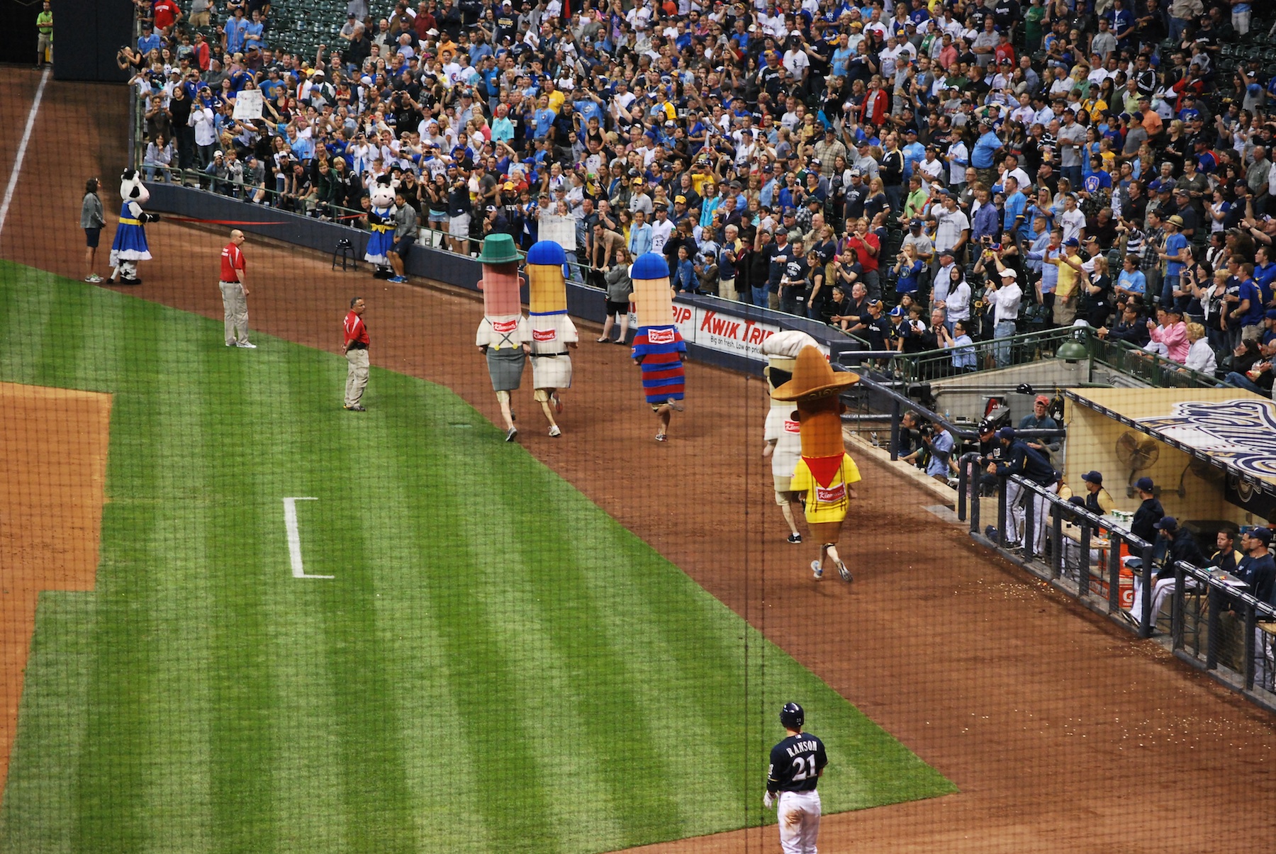 Some advice: never second guess yourself while picking a sausage race winner, it backfires. I went with the Bratwurst originally, and then right before they took off I changed it to the Italian. I hate Italian sausages, what was I thinking? Of course Bratwurst had a come-from-behind victory, cementing my original estimation that the tallest contestant would win (always look at the legs). My uncle hates the sausage race, and I never understood why. Look at the all the heads in the Brewers dugout, where are they looking? You guessed it, at the sausages! I know it’s ridiculous and all, but it’s a heckuva lot better than the tool race, or whatever it is that they do in Atlanta (and other parks), it’s a joke. In Atlanta they have a paint brush, hammer, hand saw, and power drill, and they wear these little boots. Maybe I’m a little biased, but the sausage race was the first of it’s kind, and it can’t be topped.