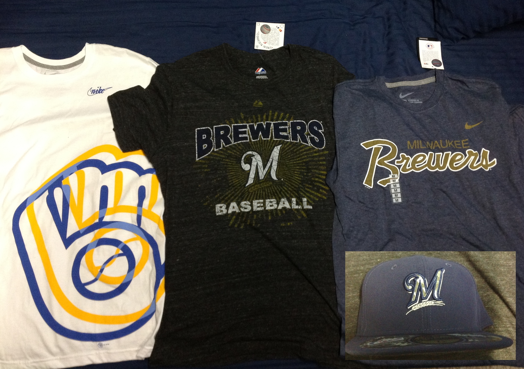 I met with Nathan in the team store by Friday’s, and he handed off the new gear that the Brewers are providing. Kathy and Tyler: I know you read the posts so I can’t say thank you enough for the merchandise and everything else you guys have done for me. Jill (the merchandising director) gets a nod as well because she worked with Kathy and Tyler to figure out how it would all work. Below are the three shirts Nathan picked out for me, and the hat that the Brewers will wear on July 4th (The fill inside the M is camouflage). I think they wore it on Memorial Day also, but I’m not certain. I was in the Upper Deck at Dodger Stadium that day, so I didn’t get any close looks at the players.