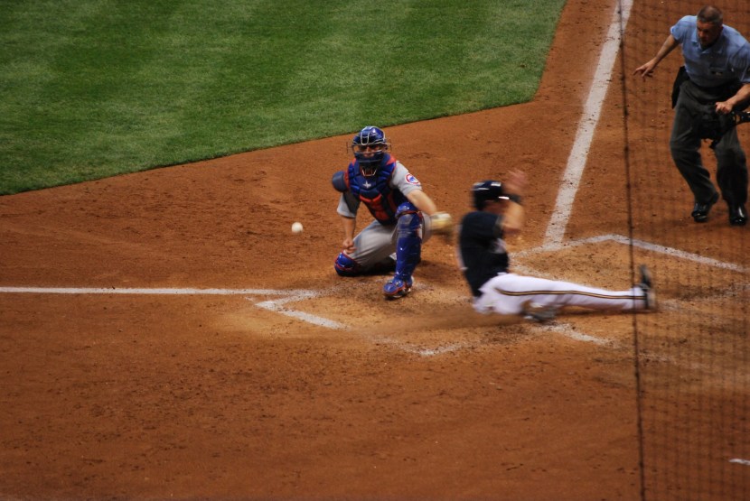 The game was scoreless early but in the fourth inning the Brewers got on the board in a big way, with four runs on five hits. Three of them scored with two outs so that was nice to see. Braun’s double scored Aoki, Ransom’s double scored Braun, and Conrad’s single scored Hart and Ransom. I got a picture as Ransom slid home safely, and again I wish I had a faster lens. The shutter speed for the below photo was 1/125 of a second, and I probably needed a 1/400 picture to achieve decent clarity. I’m starting to seriously consider purchasing a nicer lens. The $1,000 price tag is (obviously) the only thing holding me back. So I can either man up and lay down the cash, or start asking players to do things more slowly so I can capture their actions better. I would prefer the latter but I’ll probably wind up doing the former.