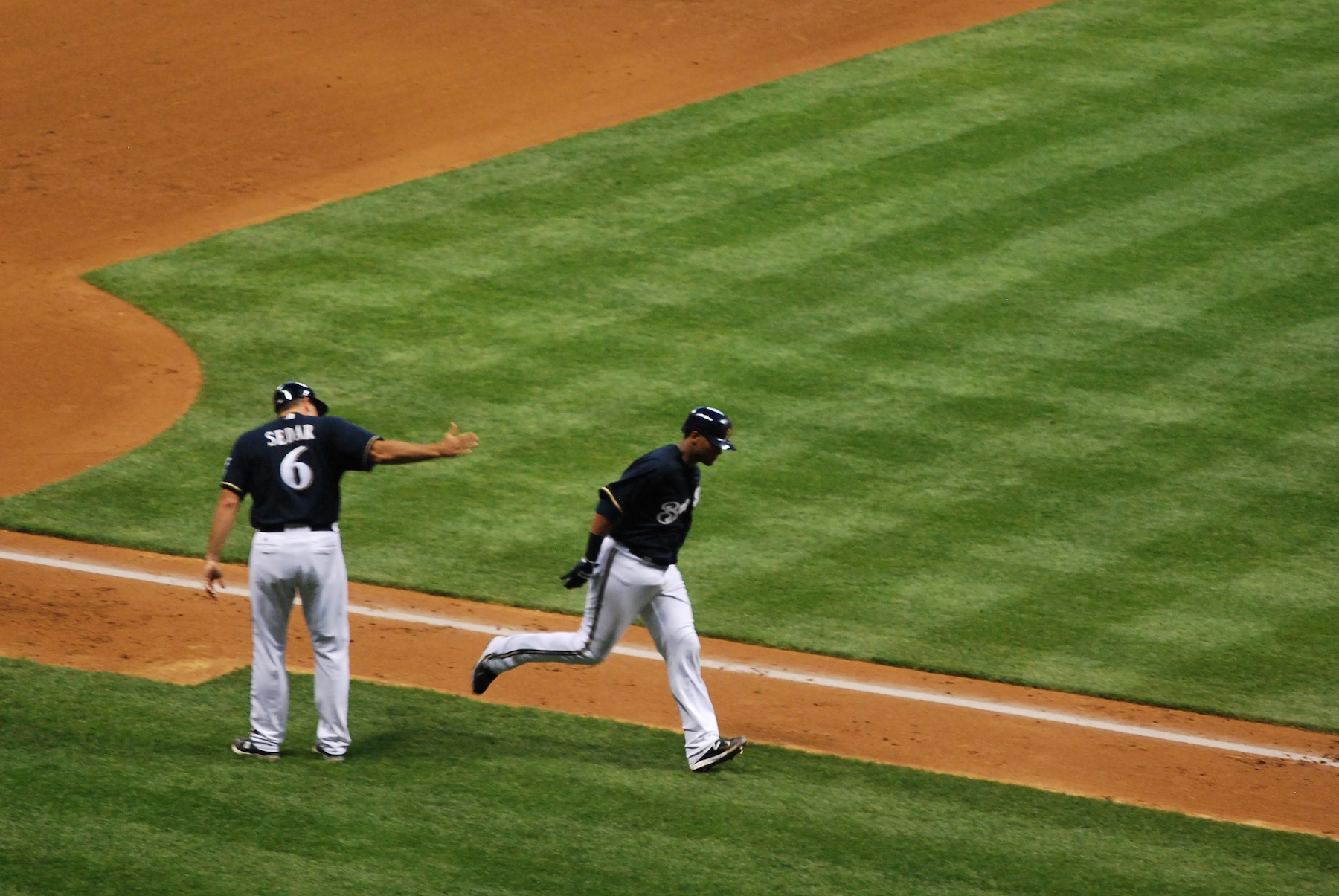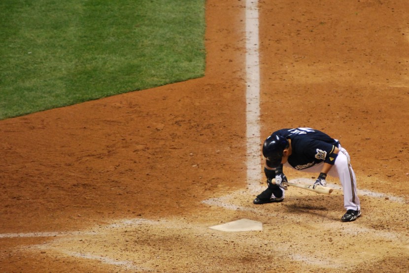 I like that you can see the fireworks, and a fan clapping in the foreground. It’s either that or she’s saying how big the fish was that she caught (I’m not impressed). Green is making his way past Sedar and Ramirez is nearing home plate. Earlier in the game I had tried to get Norichika Aoki doing his at bat routine, but the catcher was returning from the mound and ruined it all. Luckily for me (and you) he came back up in the bottom of the eighth. I’ve said that he looks like he’s doing a sumo routine or something, and that has nothing to do with the fact that he’s Japanese. It just looks like it, doesn’t it? You could also argue that there’s an ant hill next to the plate, and he’s debating on if he should let them live, I guess we’ll never know.