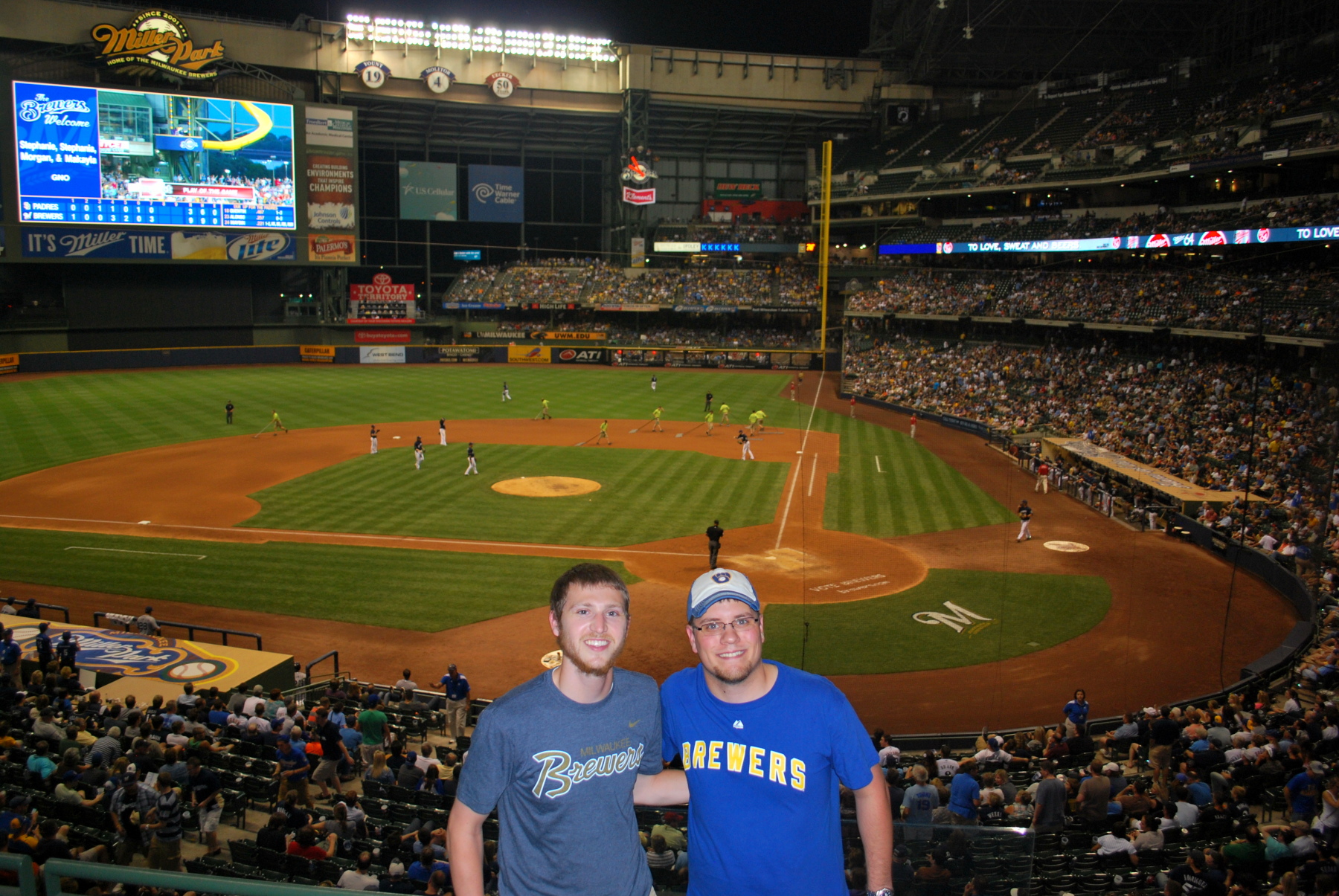 The Padres added two meaningless runs in the ninth inning, and the Brewers won. Final Score: Brewers 9 – Padres 5. During one of the half innings I had a fan behind me take a picture of me and Jason number three. She has a twenty game pack and I cannot for the life of me think of her name. She reads the blog so now she’ll know, but I’m not 100% sure that she’s ever told me. I had a great time with Jason and it was cool catching up. Now if only all of his fantasy baseball pitchers could start getting shelled 24/7, it would be a perfect world.