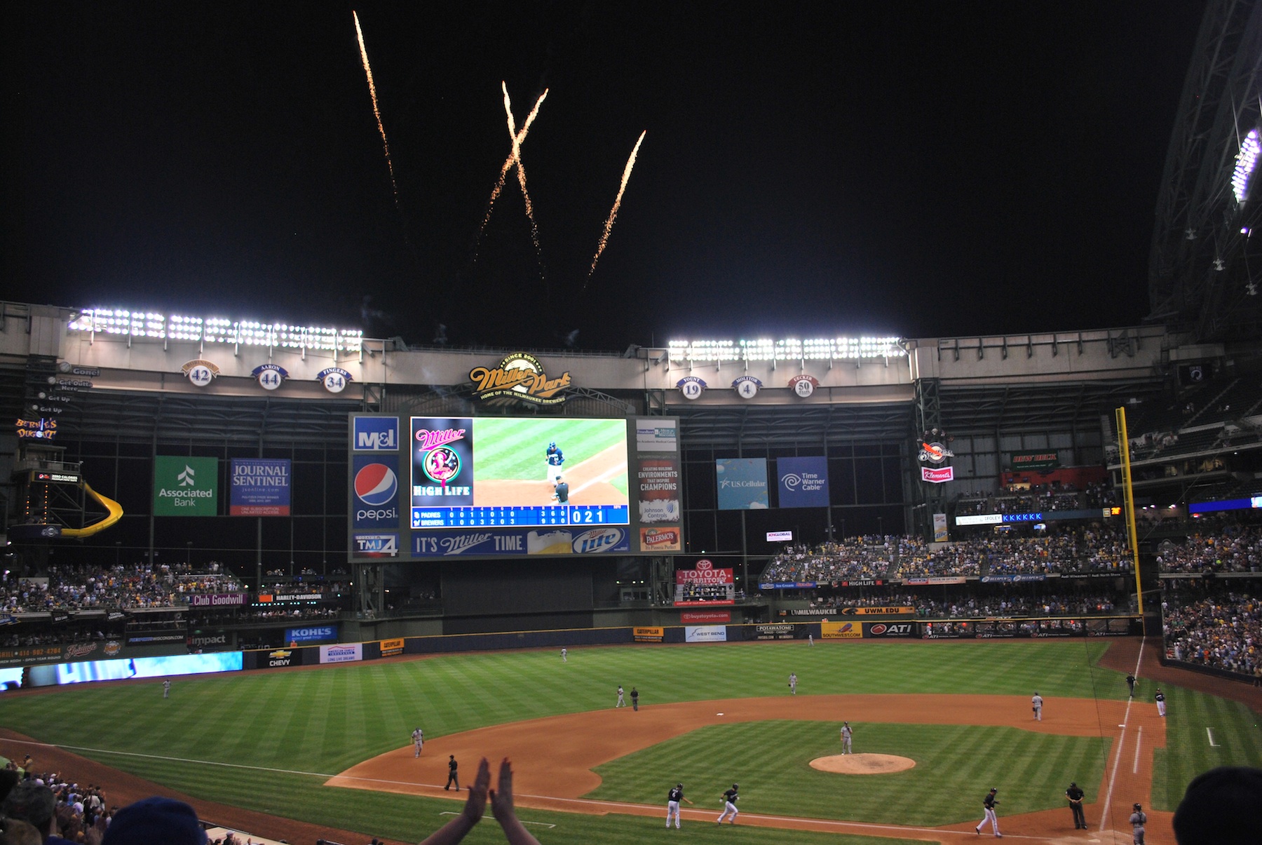 The game got underway and it began with some fireworks for the Crew, literally. Corey Hart went deep leading off the bottom of the first which set off the fireworks as he rounded the bases. The Padres tied it in the fourth when Carlos Gomez dove for a ball in front of him, and it rolled to the wall. Cabrera had a (gift) inside-the-park home run and didn’t even need to slide into home. I still don’t know why that can’t be considered an error. It wasn’t an error because he didn’t catch it, but the fact that he let it get all the way to the wall should make it a single and a three base error. Marcum worked out of some trouble in the 4th, despite walking in a run. The bases were loaded with only one out, but the one that he walked in was the only run to score in the inning. In the bottom of the fourth, and right before the Maldonado at bat Jason said that he was going yard. Second pitch of the at bat: It’s a Bingo! That’s an Inglourious Basterds reference. It almost looks like Maldonado hit Sedar’s hand so hard that he dislocated his shoulder.