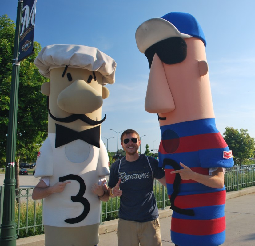 When I was nearing the bridge over Miller Park Way I came across these guys. I debated asking the Italian to stay out of the picture because I dislike Italian sausages, but decided against it. I also debated doing a thumbs down with my right hand and a thumbs up with my left, to show my disdain and appreciation for the respective sausages. Instead I went with the pistol for some reason (don’t ask why, I don’t even know).