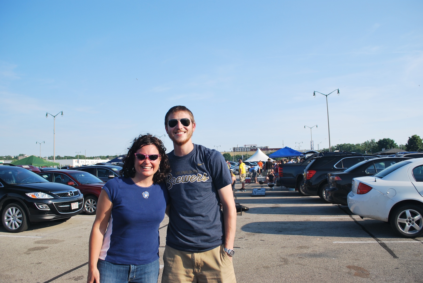I packed for the Padres series and the road trip and was on the road to Milwaukee at 3:40. After a major backup due to the 894 interchange I got to the Brewers 1 Lot at 4:54, and made my way to the general lot again. I’m trying to get back there more to hand out cards, and a former co-worker was also having a tailgate. After spending 30 minutes or so visiting with strangers I met up with Laura. Her office is actually right next to Pam’s, who joined me for Thursday’s game. Laura asked if I wanted to stop by and tell her friend about what I was doing. When I started he chimed in and said he had heard about it, but that someone else was on the quest with me. I disagreed but he was pretty sure. Finally he admitted that maybe it was a dream or something. I had Laura’s husband take a picture of the two of us before taking off. I’ll be going to the June 20th game with another former co-worker, Steve, and it’s nice to see some familiar faces. It’s also nice that they don’t hate me for quitting on them when the office was about to get hectic with a bunch of work.