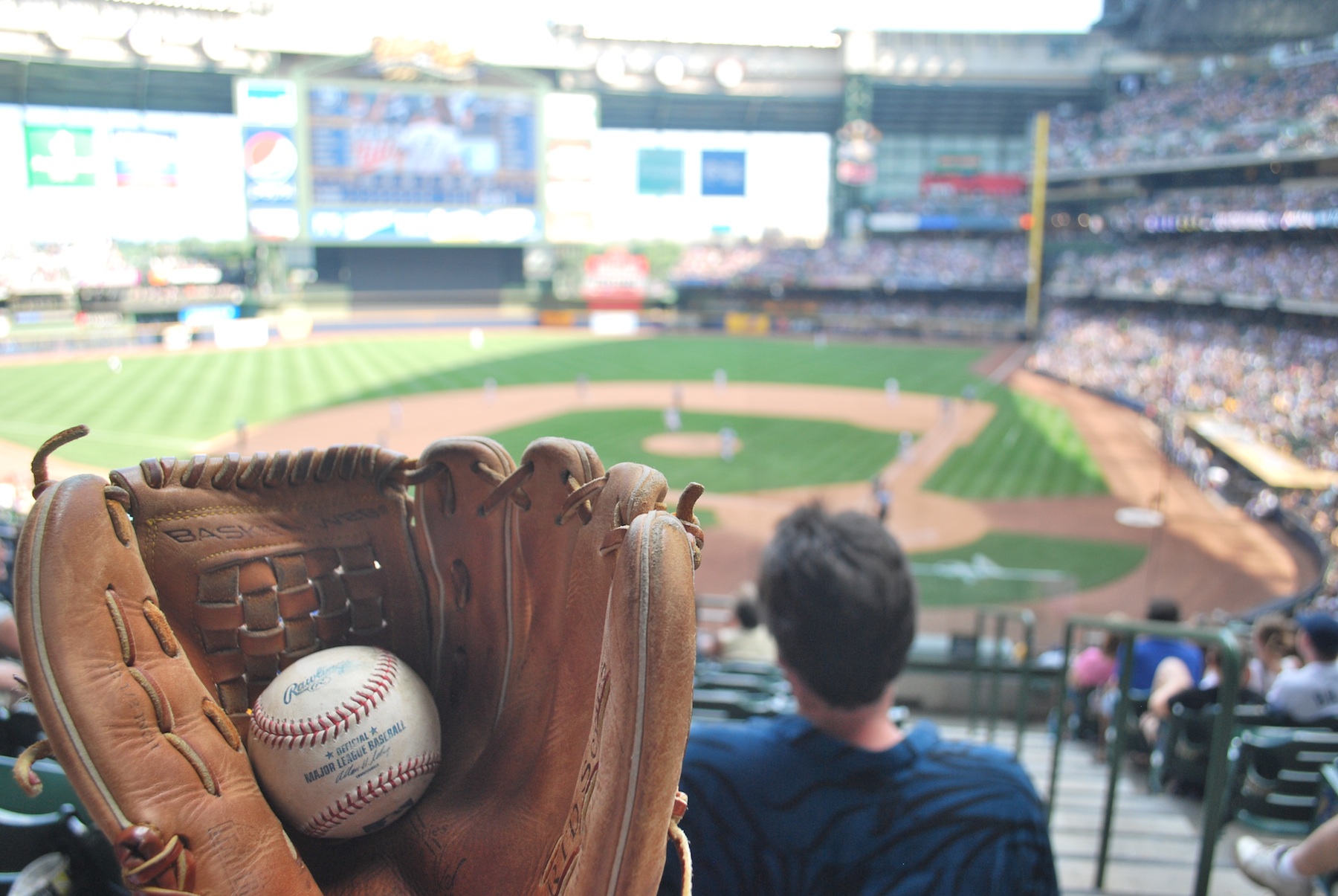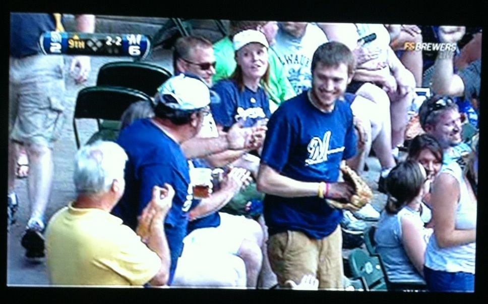 I almost didn’t catch it because I was so excited that I had started to close my glove too soon, and it didn’t land in the webbing. I gave Victoria a really hard high five and was all smiles/laughs. I wonder if I would’ve caught it without my glove. It’s always more impressive when you can, but the embarrassment involved in dropping it always outweighs the potential haters who say you shouldn’t wear a glove. I actually heard a guy in my row talking to his friends saying that I should’ve been a “man” and not used a glove. I’m pretty sure the players have gloves on the field, but I’m not going to rant. The guy to my right said “and I saw you get your glove on right before that”. Someone tweeted a picture of me when FSN showed me on the broadcast. I’m recording the replay tonight to see if they actually showed the catch, or just me afterwards. I’m talking to the guy that I mentioned above.