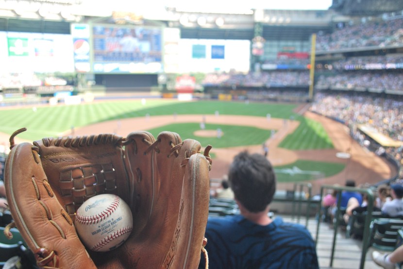 In the bottom of the eighth Victoria and I went down to say hi to Bill (I joked that I had just gotten there, but then reassured him I had just been watching from the concourse). We stood for the bottom of the eighth but then sat down in section 221, but not in my ticketed seats. To get to my seats on the other aisle we would’ve had to either make a bunch of people stand up, or go up into the concourse and back down the staircase that our seats are on. We just sat in two aisle seats opposite mine, in the 9th row. As Axford started pitching in the top of the ninth, I realized that with a upper nineties pitcher on the mound, and with a lefty at the plate (Everth Cabrera), I should probably have my glove on. After the first 2-2 pitch I reached into my bag which was on the seat in front of my and not five seconds later Axford delivers and Cabrera fouls it back my way. I took one step into the aisle and made the catch.