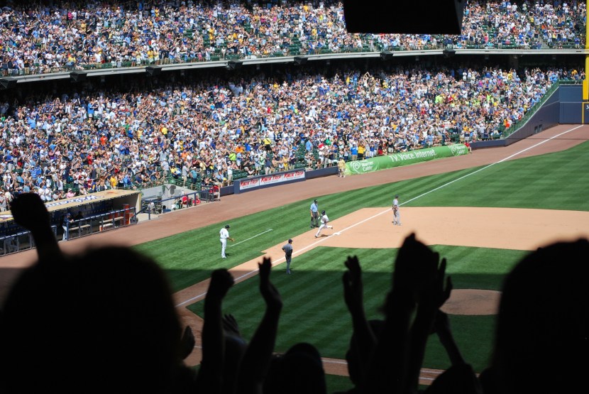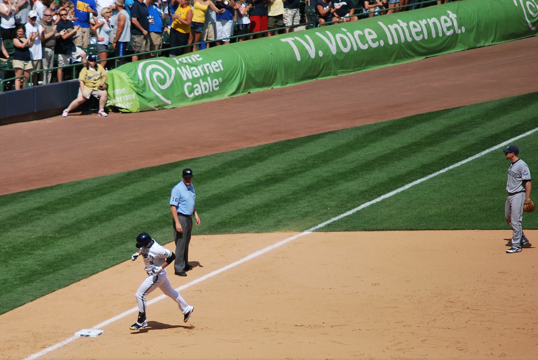 The score was still 2-0 going into the bottom of the sixth, and that’s when things got interesting. Aoki led off with a single, stole second, and then advanced to third on the throwing error by the Padres catcher. Braun singled in Aoki and the Brewers were on the board. Two outs followed Braun’s base hit, but then Rickie Weeks walked to bring up Martin Maldonado with two on and two out. On the first pitch Maldonado lifted one to deep center, and Cameron Maybin looked like he had a read on it. He leaped and it just missed his glove, clearing the fence by just a few inches. As Maldonado was rounding third I got a picture of the action. Ed Sedar is waiting with his hand out, Maldonado is preparing for the medium five, all while the crowd goes wild.