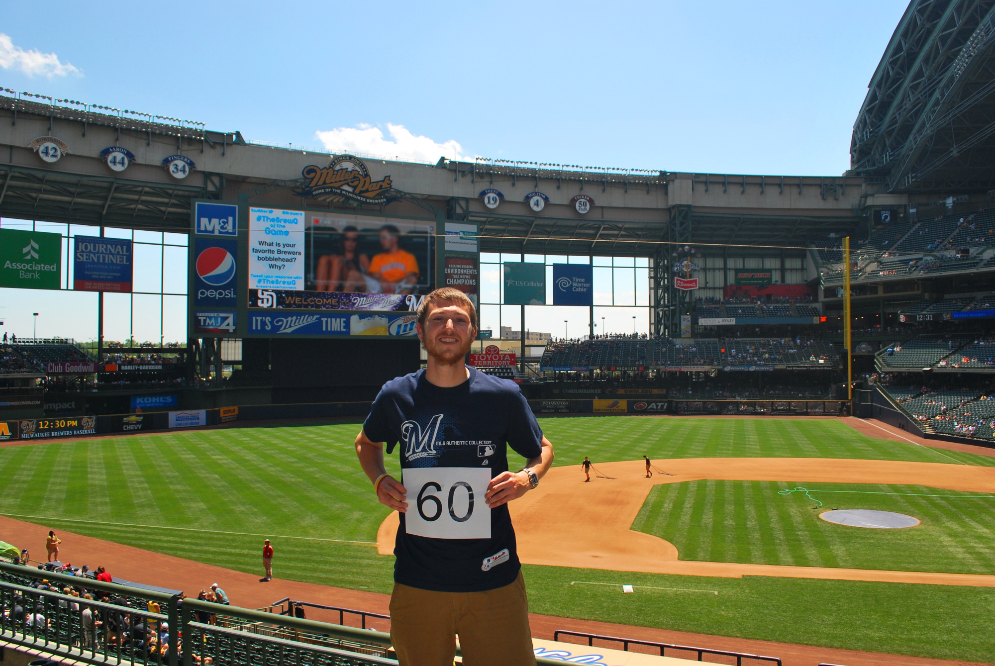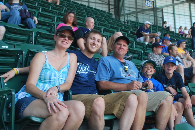 After getting the game photo taken care of, Victoria and I went and said hi to the Ice Man and then went up to section 425. My Uncle Mark and Aunt Deb were at the game with their two sons; Wade and Travis. Wade had gotten four tickets to a Brewers game for Christmas, and it just so happened that I was at the same game. That’s CRAZY!!! This was Wade and Travis’ first Brewers game, and Mark and Deb’s first since Miller Park opened. Below you have Deb, myself, Mark (my mom’s younger brother), Travis, and Wade. My mom is a Sykes, and has 11 siblings. In 2010 the family made a address and birthday handbook thing, and I referenced it to see how old Travis and Wade were. I was shocked when I saw that Travis just turned 10 and Wade 14. I know I’m only 25, but now I feel old.