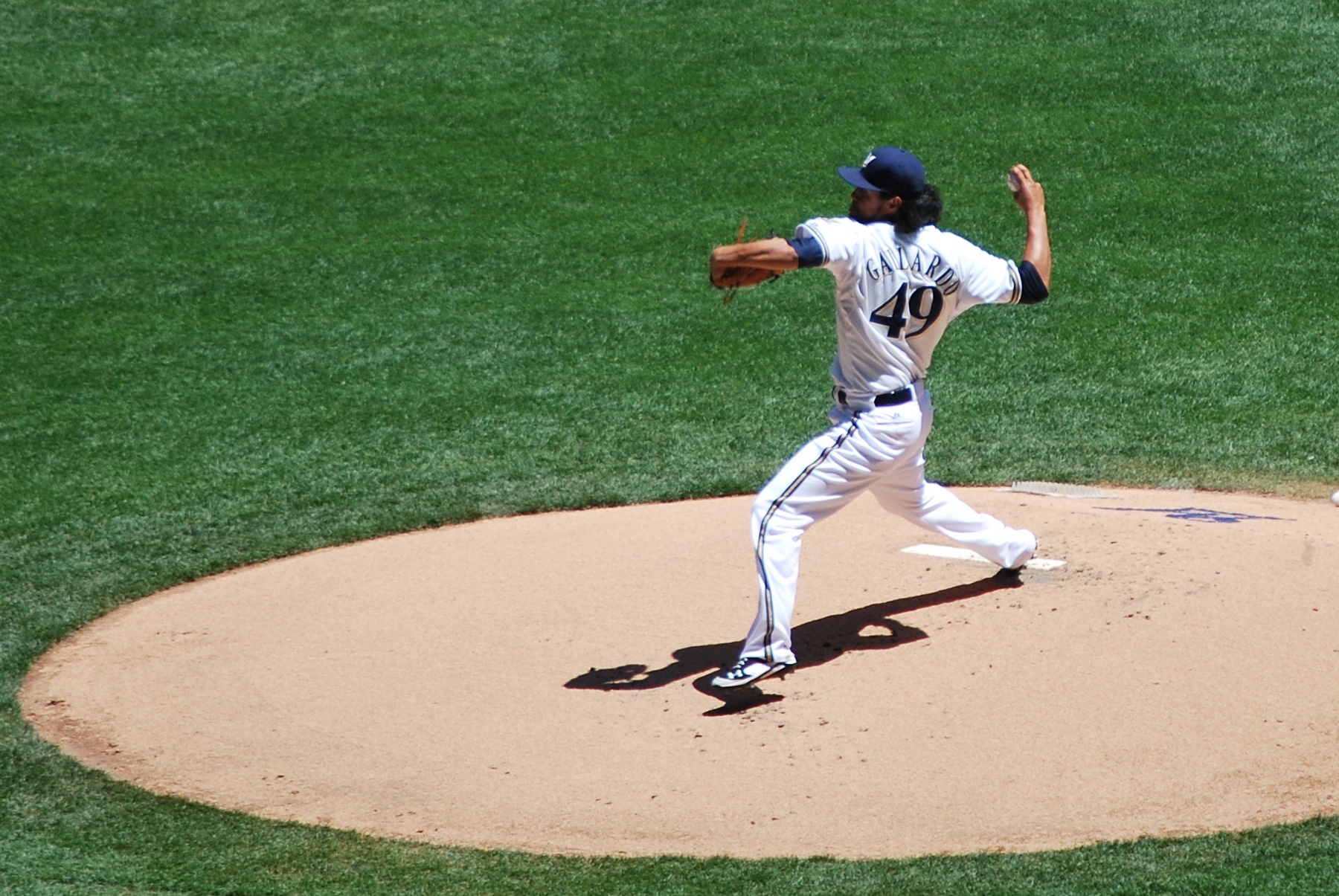 Victoria and I went back down to the loge level, and decided to watch the majority of the game from the concourse above section 213. For some reason they decided not to close the two panels on the first base side, and it allowed for some good photo opportunities. Gallardo was on the mound for the Brewers, and he gave up a solo home run in the first and another run in the second on a ground out. This is Gallardo pitching in the first.