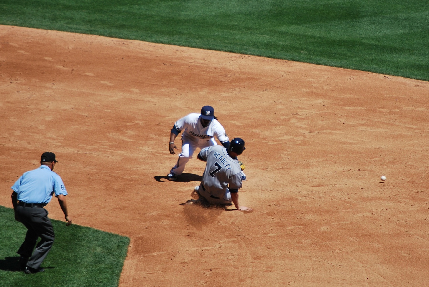 In the top of the third, Chase Headley of the Padres walked, and then attempted to steal second. I’m not sure he would’ve been out, but Weeks got charged with an error on the play, and Headley wound up at third. Here’s Headley sliding as the ball heads towards the outfield grass.