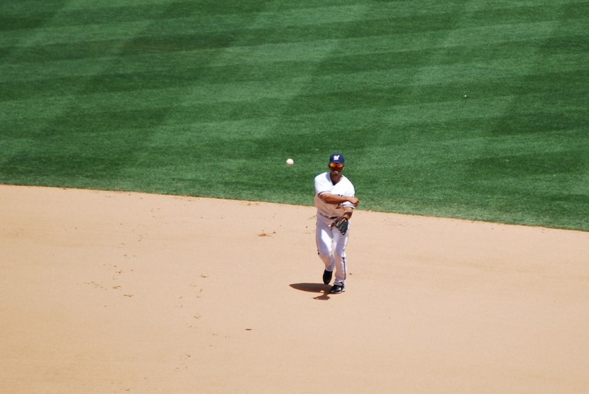 In the top of the sixth Cameron Maybin grounded out again, this time to shortstop. I got a picture shortly after Edwin Maysonet let go. The throw wound up high, but Corey Hart jumped for it and on his descent tagged Maybin on his way to first.