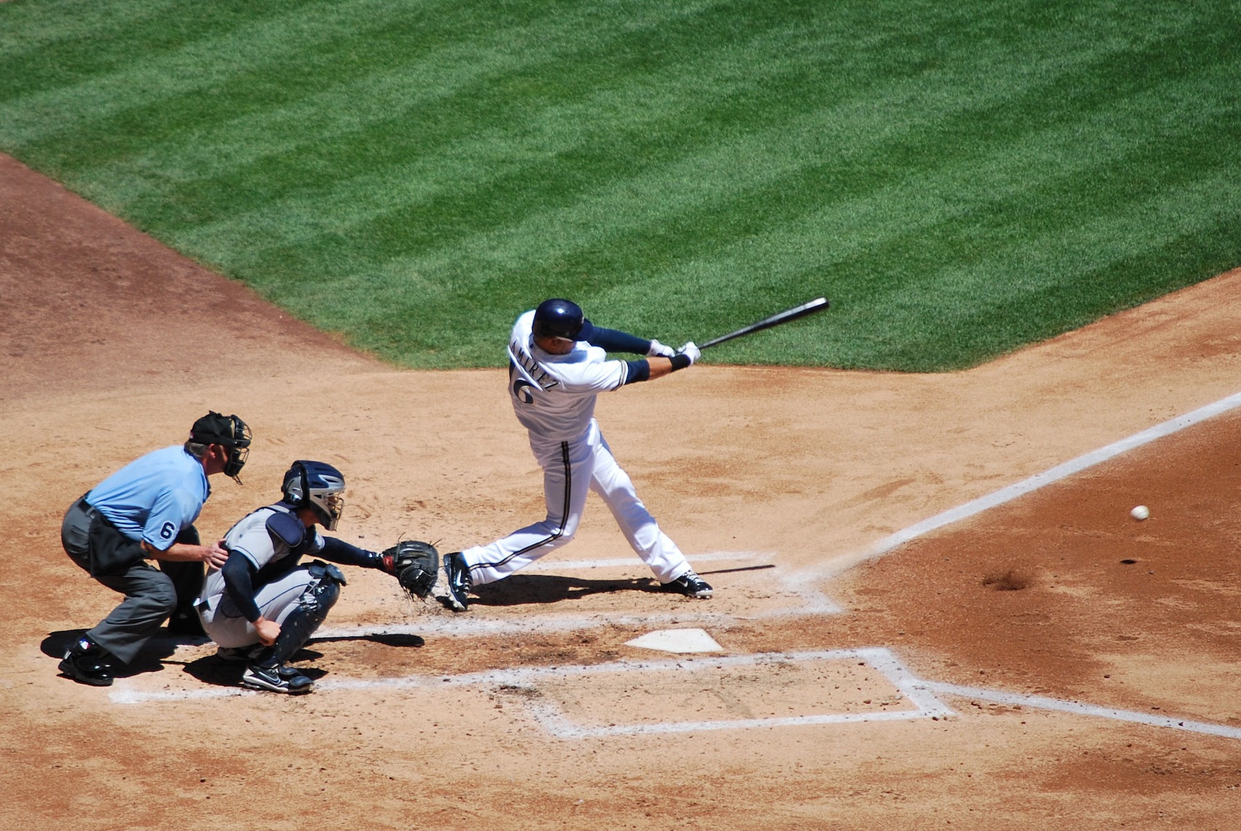 Aramis Ramirez led off the bottom of the second inning with a ground out to the shortstop. I snapped a picture just after the ball bounced off the infield dirt in front of home plate. You can see the dirt flying from the impact.