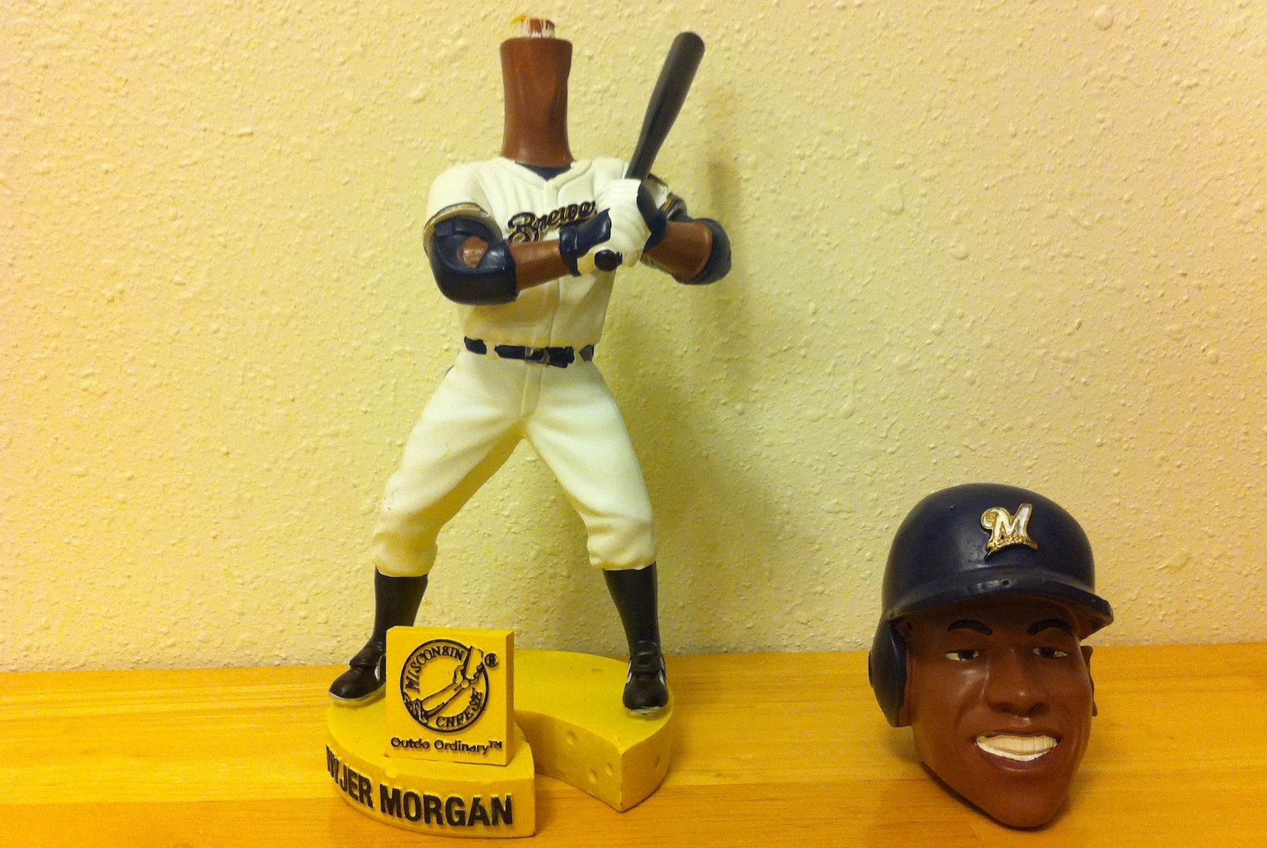 When Victoria and I got back to Madison I took our Nyjer Morgan bobble heads completely out of the boxes to inspect. Apparently they didn’t put enough glue on, because his head wasn’t connected to the spring when I took it out of the plastic. It’s an easy fix though, so I’m not too upset.