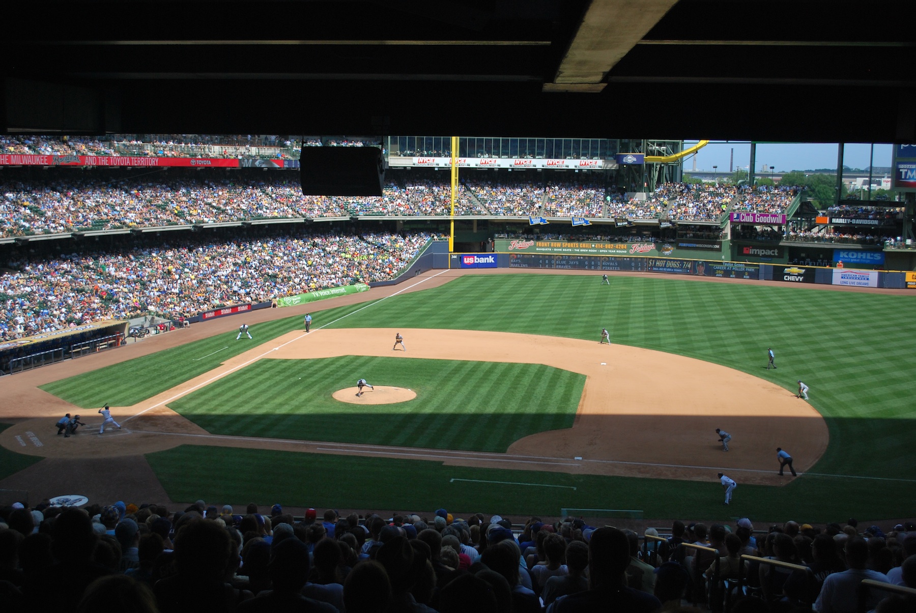 In the bottom of the fourth I swapped out my zoom lens for the standard 18-55 mm and zoomed out to show our view from the concourse. Anthony Bass had just let go of a pitch, with Taylor Green at the plate. The roof’s shadow is between the mound and the plate, and this is what the Brewers prevent from happening when they close the two roof panels on the first base side .
