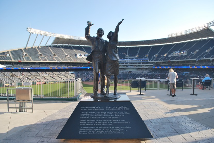 In left-centerfield there is a statue of Ewing Kauffman and his wife Muriel. They were the founding owners, and brought baseball back to Kansas City. The Kansas City A’s (previously the Philadelphia A’s, and currently the Oakland A’s) were in KC from 1955 to 1967. The Royals’ first season in Kansas city was 1969 and they’ve been in Kauffman Stadium since 1973. It was known as Royals Stadium from 1973-1993. The park was renamed Kauffman Stadium just a month before he passed away in August of 1993.