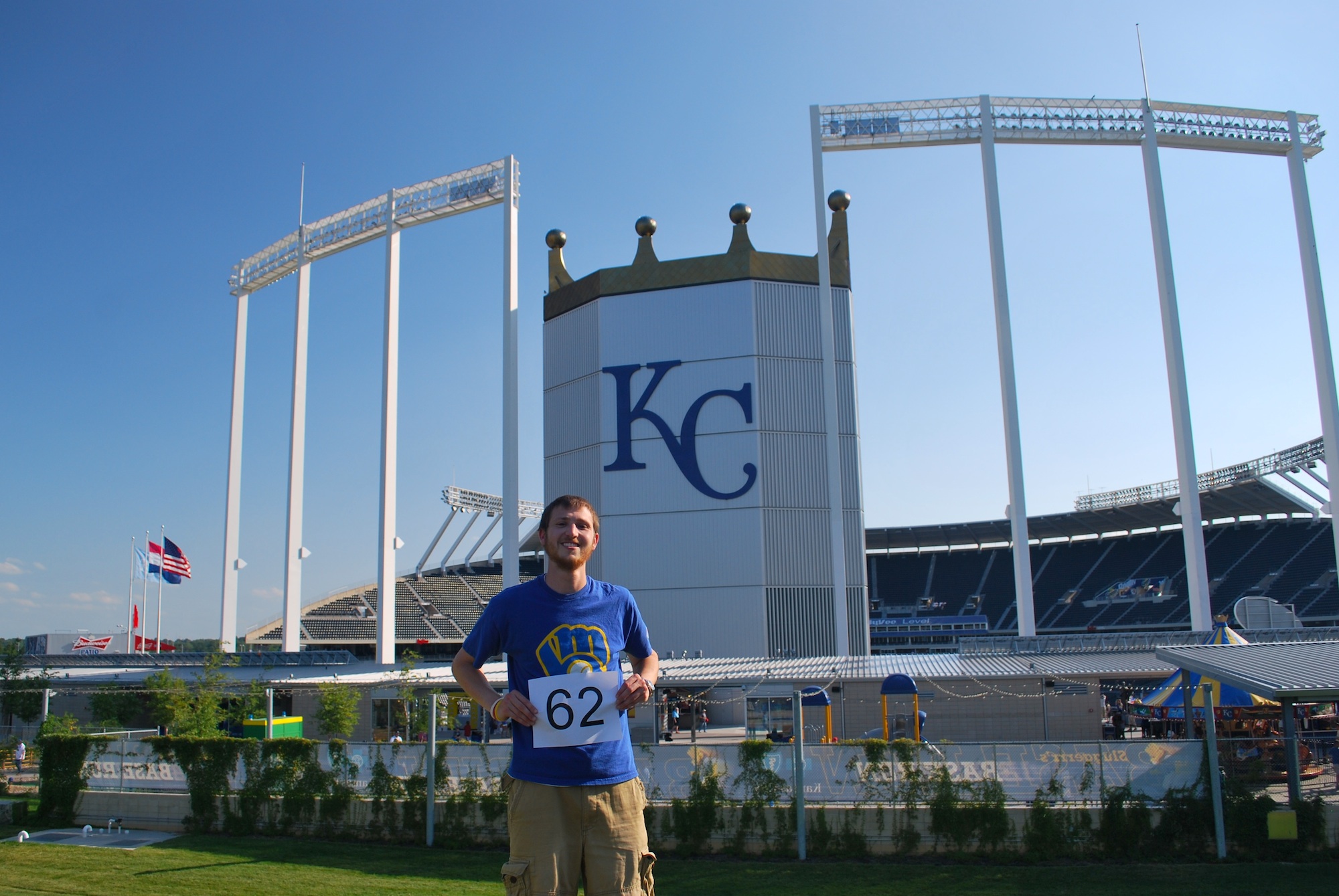 I was done at the museum just after 4:45, and left for Kauffman Stadium from there. I was meeting my friend Matt (it feels weird using first names), and he got to the parking lot shortly after I did. We went to middle school and high school together, and we both went to UW-Madison as well. We didn’t see each other much during college, but we’re still friends, and he’s in the fantasy baseball league that I’m the commissioner of. I was planning on getting the game number photo from behind home plate in the upper deck on Wednesday, and then from my seat on Thursday. Since we had plenty of time, I figured we should at least see if there was a good spot to capture the back of the scoreboard. It took some walking, but we found a good spot. I know I usually don’t get two pictures from outside the stadium, but I made an exception. Game photo number 62: