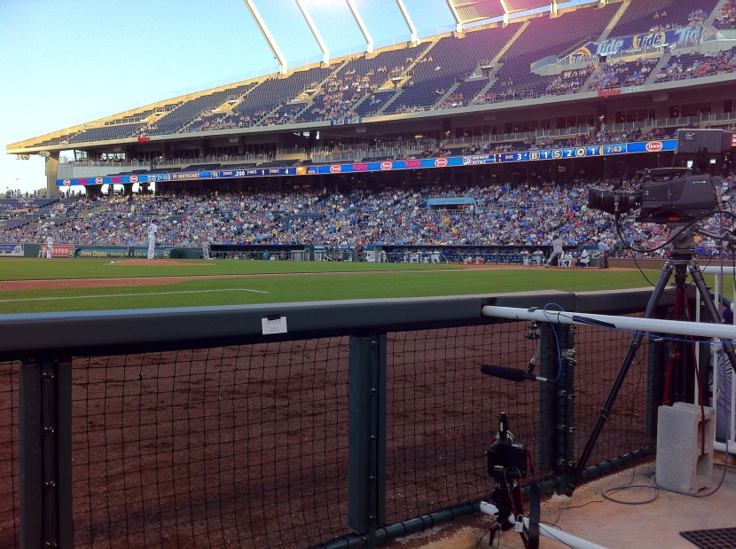 I had met Craig Coshun by the BATS Club entrance and we went under the seating bowl to reach the camera well. While walking down one of the tunnels Zack Greinke was coming up to get something out of the visitor’s clubhouse. I missed the Kottaras pop out because it takes so long to get to the well, but saw the infield hits and the run that scored in the top of the third. This was my view from Craig’s chair in the camera well. He graciously allowed me to sit in his folding chair while he stood next to/leaned on an electrical box.