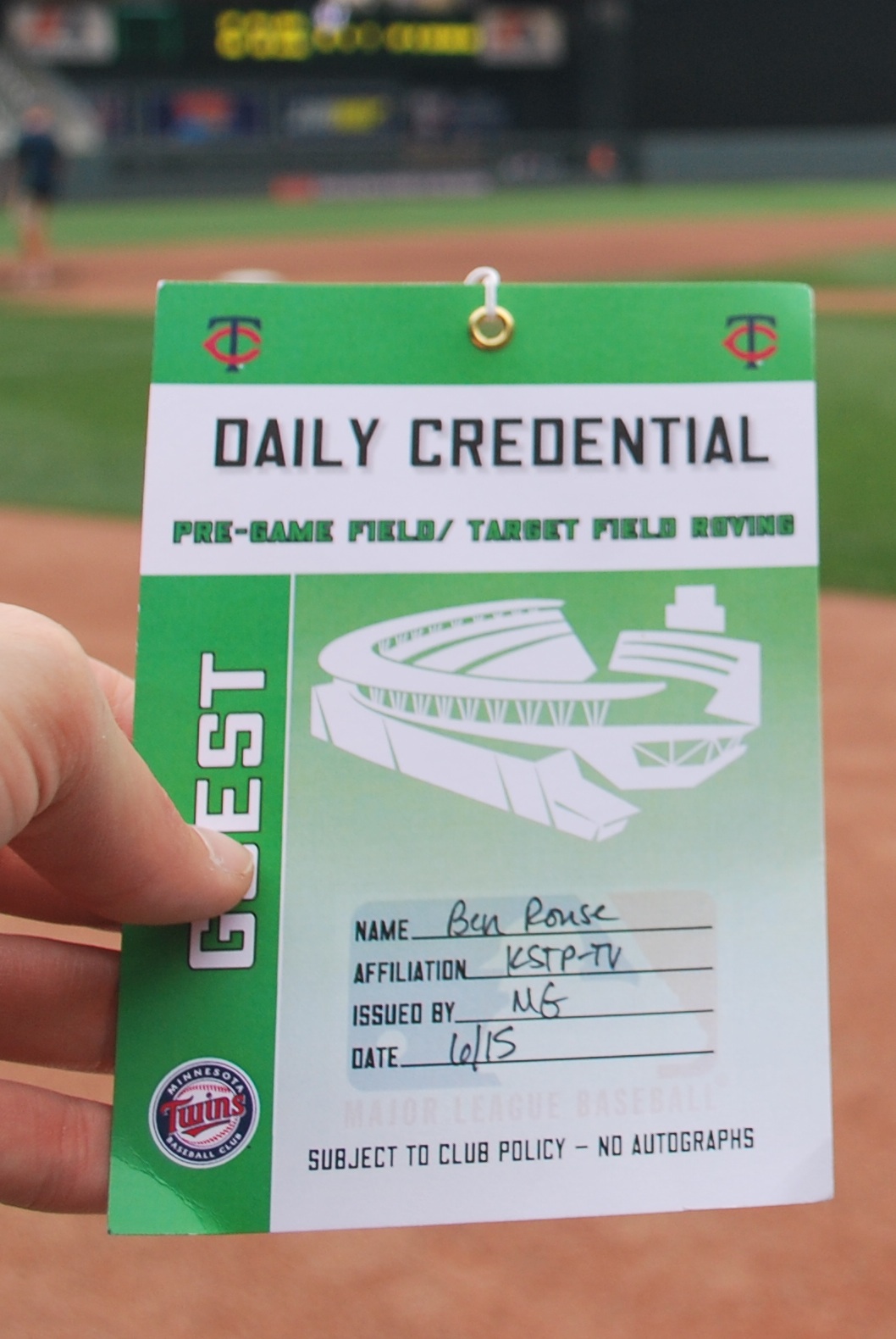 I got to Chris and Amber’s place in Minneapolis at 6:15 on Friday morning. Amber is Victoria’s friend from college, and Chris is her fiancé. I took a nap until 11:15 and then got up to write the post for Thursday. I’m glad I left Kansas City on Thursday night and not Friday morning. Yes, I was exhausted when I was done driving, but I felt better about getting to Minneapolis at 6:00 am on game day rather than 2:00 pm. I left for Target Field at 2:20 because I had an interview with KSTP TV (Minneapolis’ ABC affiliate) at 3:00. I picked up my credentials from gate 29 and then took an elevator down to the press level of the stadium.