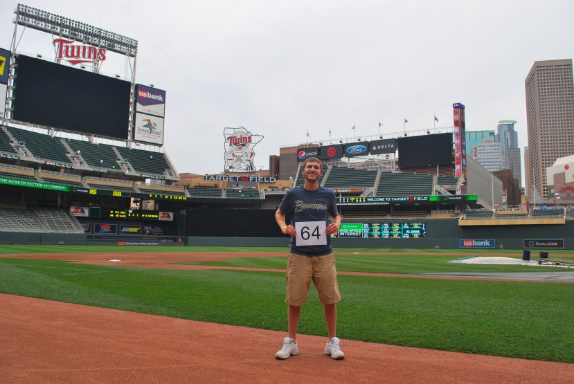 They left right after the interview but I hung around for a bit, and Craig Coshun and Jerry Augustine appeared in the Brewers dugout. Rickie Weeks came out and Coshun interviewed him, and then Tim Dillard. I talked with Augie for a few minutes and then asked if he wouldn’t mind taking game photo number 64 for me. I know that I’ve always gotten the first picture of a new stadium from the exterior, but I’m not going to be on the field any of the other days, so I figured what the heck. Thanks Augie!