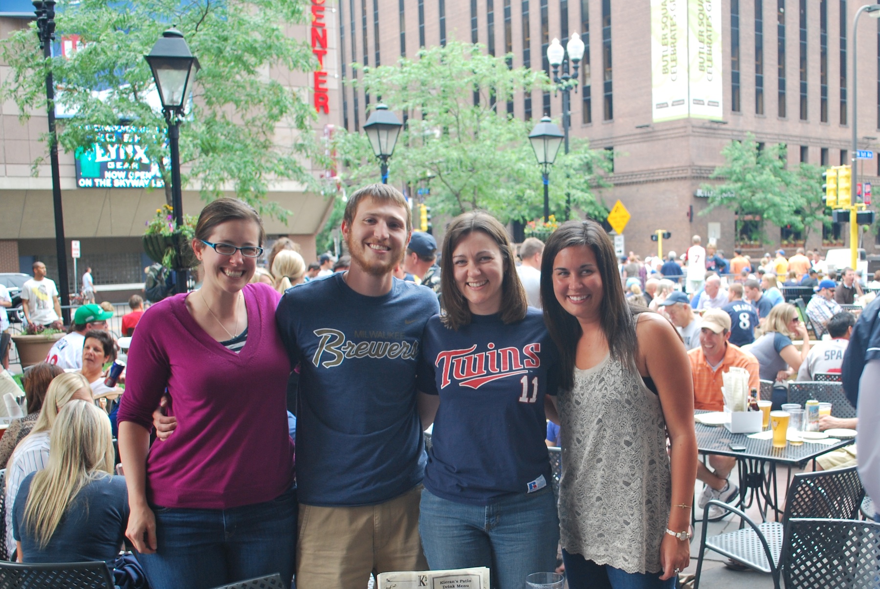 I had gotten a call and a voicemail from Tom Miller of the Janesville Gazette during my interview with KSTP. He wanted to do an interview for an article that would run in Sunday’s paper. I called him back and did the interview from a seat in section 111. I was done with the interview at 4:25 and I left the stadium to meet up with a few Be The Match employees. Nicole has been my main contact with Be The Match, and she asked if I had wanted to join her and two co-workers for Happy Hour at a local pub. I walked the two blocks to Kieran’s Irish Pub, and found them on the patio outside. It’s an enormous patio and it can probably fit 150 people out there. I had two beers and we talked about my mission, Be The Match, and cats. One of her co-workers, Kristin, is a transformed cat lover. We exchanged stories and pictures while Nicole and Jenna laughed to themselves. If they had a cat like Prince they would brag as well. Before we left the pub I had a nearby gentlemen take a picture of the four of us. Left to right you have Kristin, myself, Nicole, and Jenna. Kristin works in marketing for Be The Match and Nicole and Jenna both work for the Be The Match Foundation.