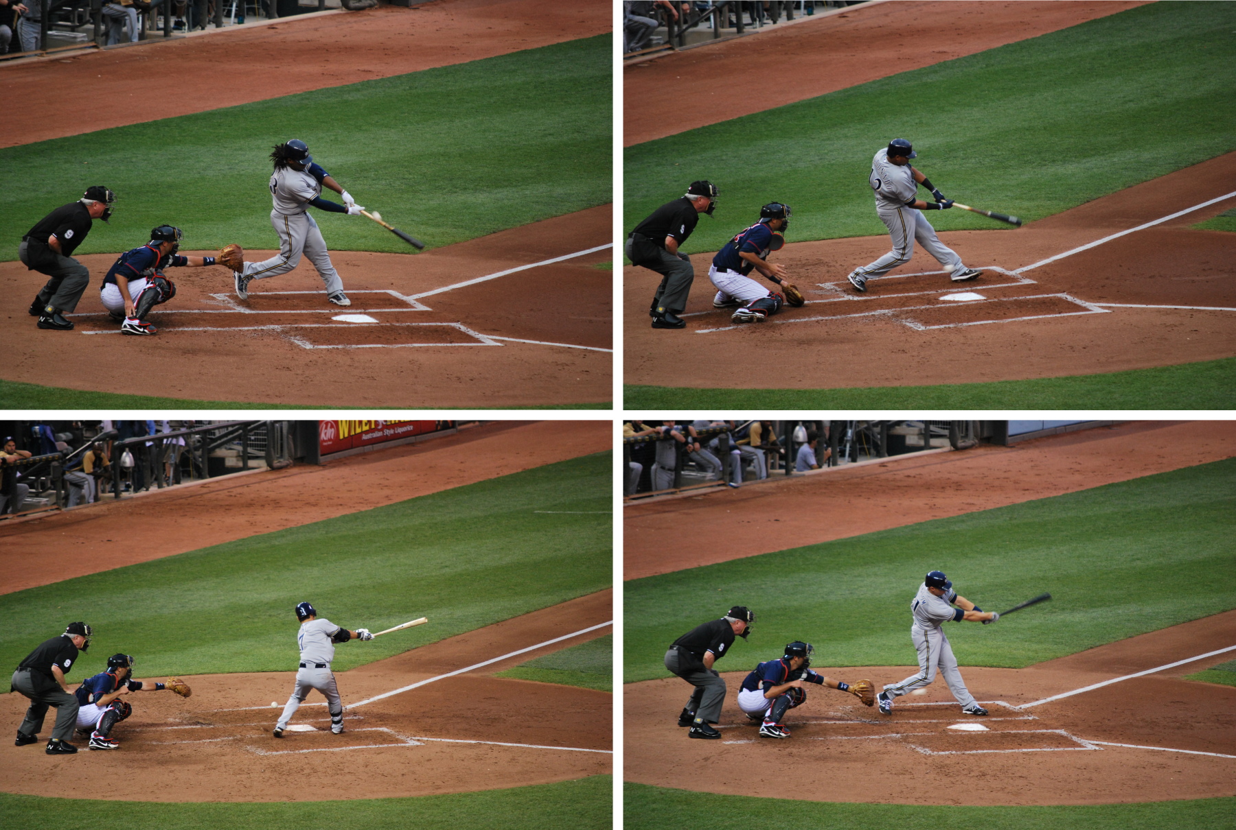 The game moved along quickly through the first four innings, and remained scoreless. The Twins starter, Francisco Liriano, was dealing, and he had a no hitter through five innings. Here’s a an example of how things were going. Going clockwise from top left.