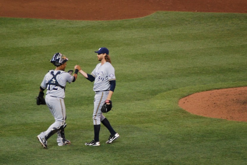 4) Nyjer Morgan giving Braun an extremely low target for a high five as he enters the dugout.