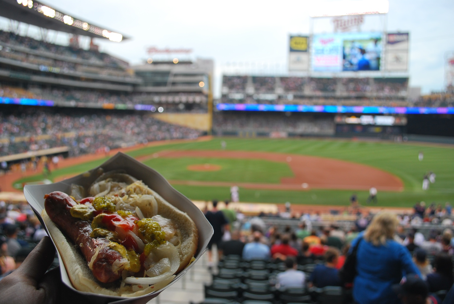 Nicole had tried to get tickets but then gave up, so we parted ways as we left Kieran’s. I walked to Target Field and was inside by 6:35. I had been told that Kramarczuks had a good polish sausage so I hit up one of the stands before heading to my seat. It looks amazing but I was underwhelmed. The casing was too hard, which causes you to use more force when taking a bite, which in turn causes all the contents to fall out of the bun. On top of that it was lacking in the flavor department, in my opinion. Today I’ll try the fried walleye on a stick, since I won’t be able to get that anywhere else this season.