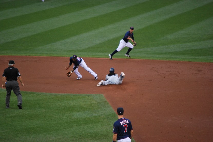 Rickie wound up walking in his at bat in the second inning, and stole second base. I got a picture of him sliding in safely as Twins second basemen Alexi Casilla snags the one-hop throw from the catcher.