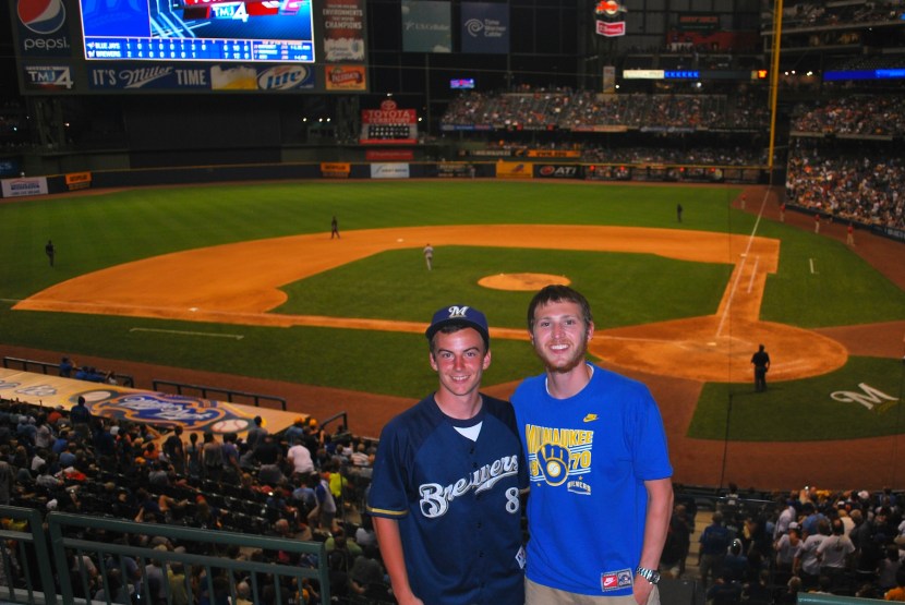 In the middle of the eighth inning I had a fan a few rows in front of us take a picture of Brandon and me. Brandon is on the left and I’m on the right. Besides the fact that Brandon is attending UW-Madison (my alma mater), he also attended 43 Brewers games the season that began in the Spring of his freshman year of college. That’s the same number I attended between my freshman and sophomore years at Madison. He’s a cool guy, a huge Brewers fan, and I wouldn’t mind sitting through another Brewers victory with him in the future.