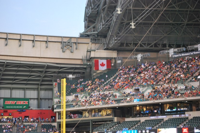 Brandon and I got to our seats just before the National Anthems, and we noticed this up near the roof. You may have noticed that I said Anthem[S], and that’s because the Brewers were taking on the Toronto Blue Jays, and both “O Canada” and “The Star-Spangled Banner” were sung before the game got underway.