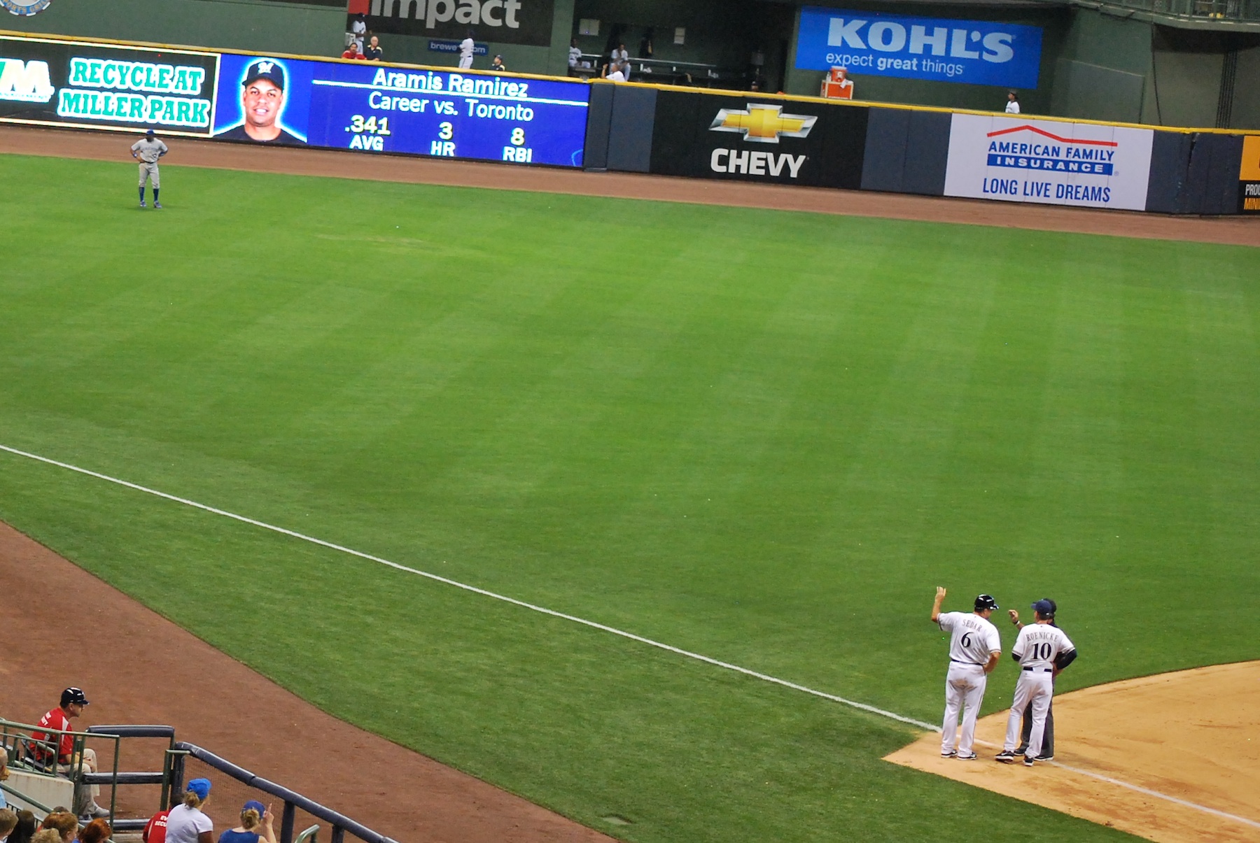 In the bottom of the seventh Aramis Ramirez led off and lined one down the left field line that hit some sort of wall. The whole stadium likely heard the smack as it hit the padded portion of the outfield wall. The third base umpire called it a foul ball, and Ron Roenicke came out to argue. Here he is with Ed Sedar as they discuss with the third base umpire where (they think) the ball hit.