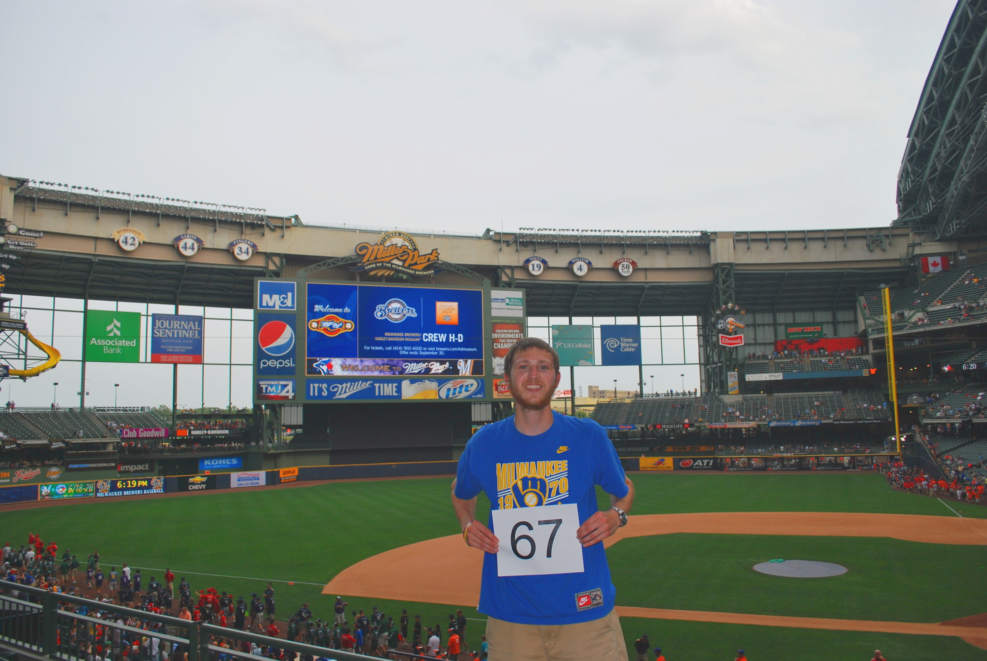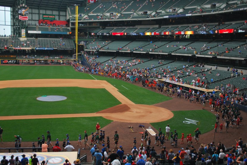 Brandon met me inside in section 223 where I was planning on getting the game number photo taken. I had forgotten that it was Little League Night and that the Brewers allow this to happen: