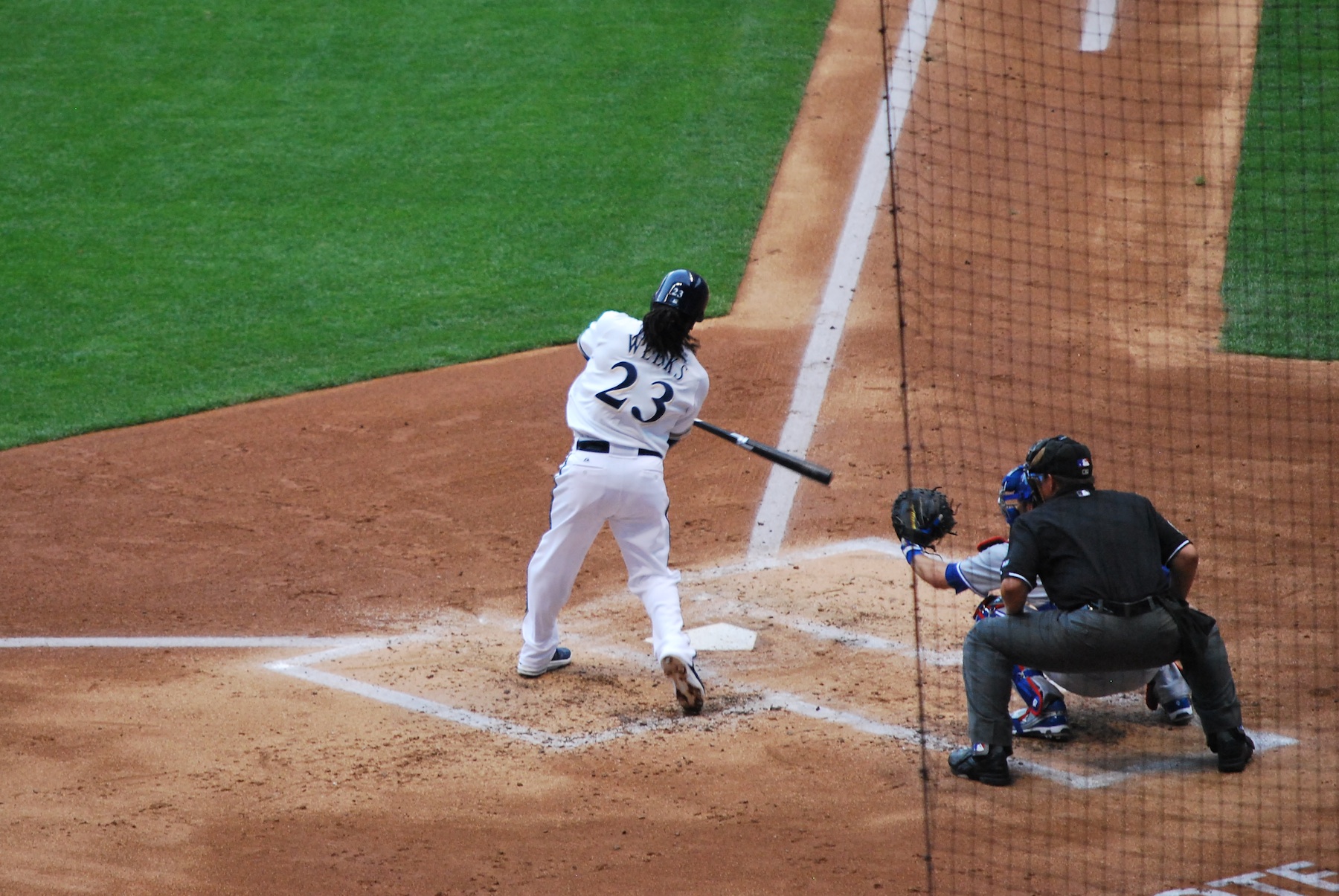 The game started off great, if you were a Blue Jays fan. Brett Lawrie, who in addition to some other minor league prospects at the time, was traded to the Blue Jays for Shaun Marcum in the offseason leading up to the 2011 season. On the second pitch that Lawrie saw, in the stadium that he almost called home, he sent an opposite field home run out to right center to give the Jays the lead. In the bottom half of the first inning the Brewers came right back, and on a full count pitch Rickie Weeks drove one to the outfield to drive in two runs. This was the swing that resulted in the hit. Even though you can’t see the ball I promise you he made contact and drove in T-Plush and Braun.