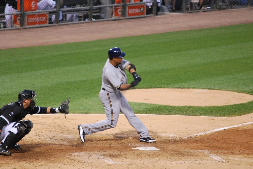 In the second inning the White Sox took a 2-1 lead when they got back-to-back one out RBI singles from Viciedo and Alexei Ramirez. The Brewers came back in the third and tied it on an RBI single from Braun. In the bottom of the fourth the White Sox again went in front (4-2), this time on a two-run home run from Viciedo. The Brewers scored one in the fifth on an RBI single from Nyjer Morgan, then three more in the sixth to take a 6-4 lead. RBI singles by Maldonado and Ransom accounted for the first two runs in the sixth, and a sacrifice fly from Gomez the final run. This next picture is of Gomez, just before he connected on the sacrifice fly. I don’t know why, but his bat and the ball are almost unidentifiable. If you click on it and look closely you can see the bat and the ball, but they are both pretty hard to see. I labeled it “Gomez without a bat?” because if you just glance at it that’s what you’d think. The scientific reason for their appeared disappearance is the speed of the bat and the ball, the slow shutter speed (1/160th of a second), the lighting, and the fact that both his bat and the ball are relatively light objects to begin with.