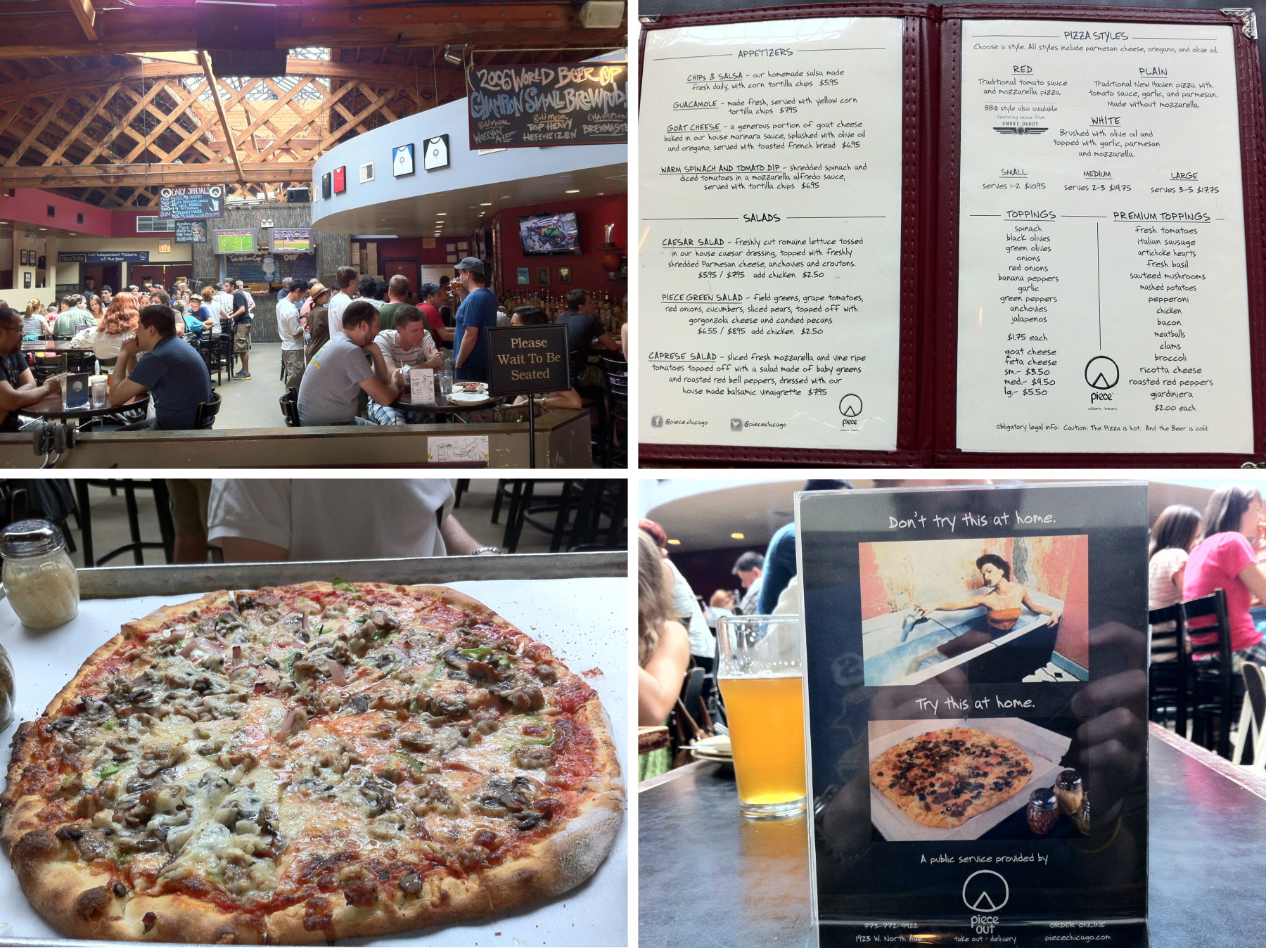 I didn’t get up until 11:15 on Saturday morning, but I didn’t go to bed until after 2:00 am the night before, so we’ll call it even. Jess was helping throw a bachelorette party for a friend of hers, so Alex and I had time to hang out. We played two games of cribbage (I won them both) and then we jumped on the L at 2:00 pm. We took the blue line to the Damen stop, where we got off and walked to Piece, a pizza place on Milwaukee Avenue. The four parter below explains what went down. Going clockwise from top left: